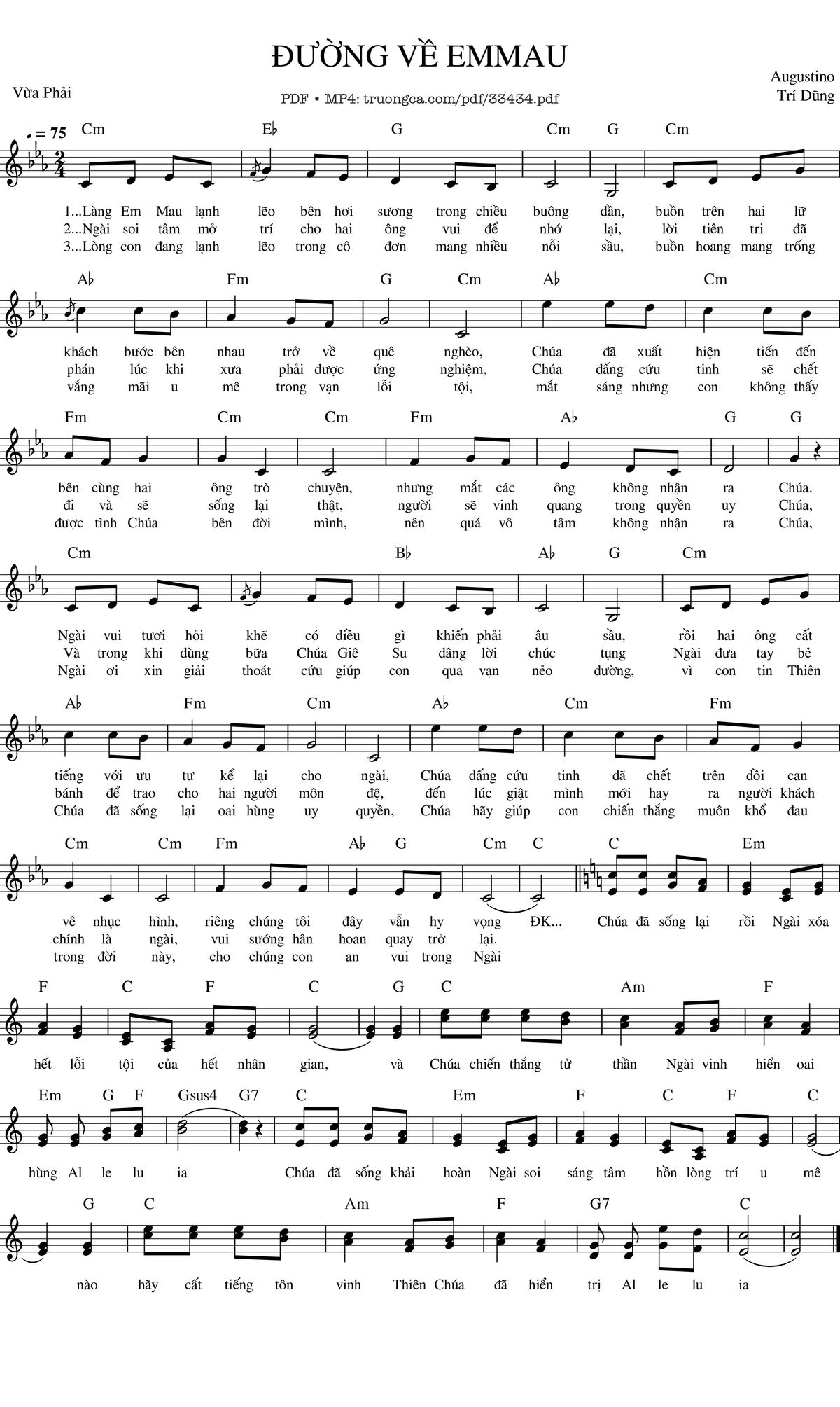 Transposition is the process of moving a song's melody and chords up or down in pitch by a constant interval. The direction of the transposition tool is indicated by a plus (+) sign for up and a minus (-) sign for down. Hover mouse over chords signs to see the chords chart of Đường Về Emmau song.