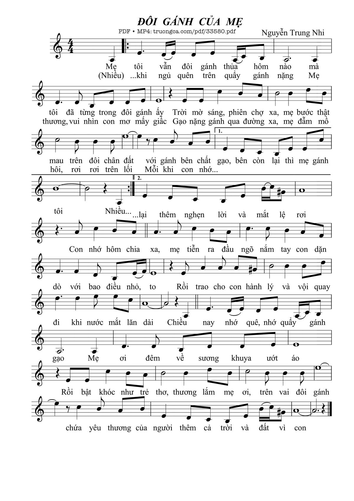 Nguyễn Trung Nhi Mẹ tôi vẫn đôi gánh thuở hôm nào Mà tôi đã từng trong đôi gánh ấy [PDF] [Sheet] [Lyrics] [Mp4/Midi]