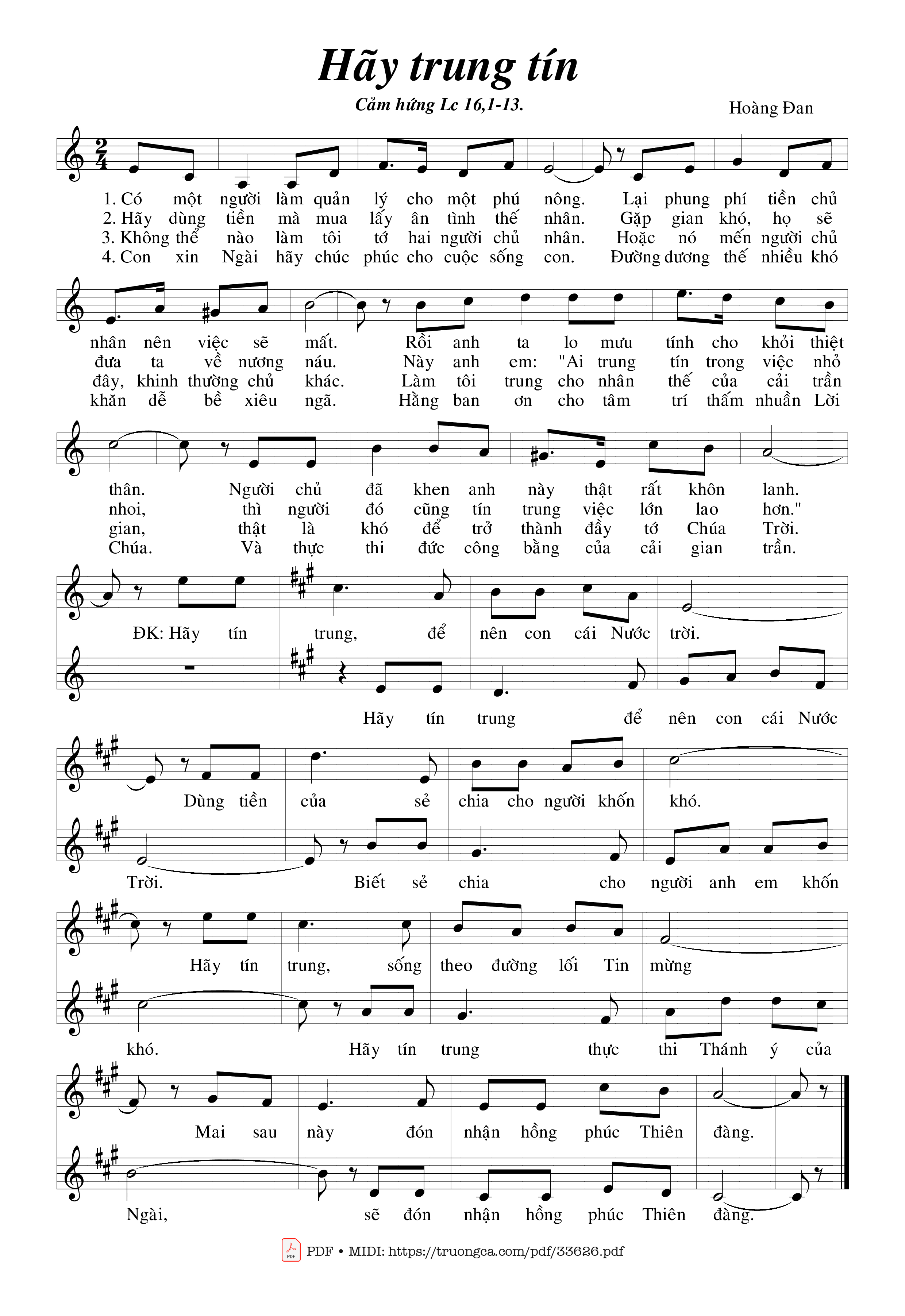 Điệp khúc: Hãy tín trung để nên con cái Nước Trời. Dùng tiền của sẻ chia cho người khốn khó. Hãy tín trung sống theo đường lối Tin mừng. Mai sau này đón nhận hồng phúc Thiên đàng.
