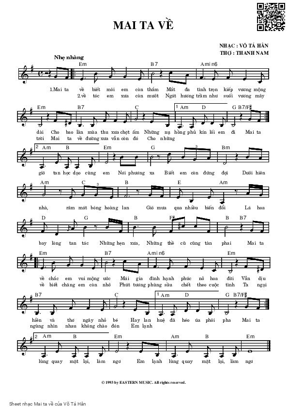 Võ Tá Hân Mai ta về biết môi em còn thắm Mắt đa tình trọn kiếp vương mộng dài [PDF] [Sheet] [Lyrics] [Mp4/Midi]
