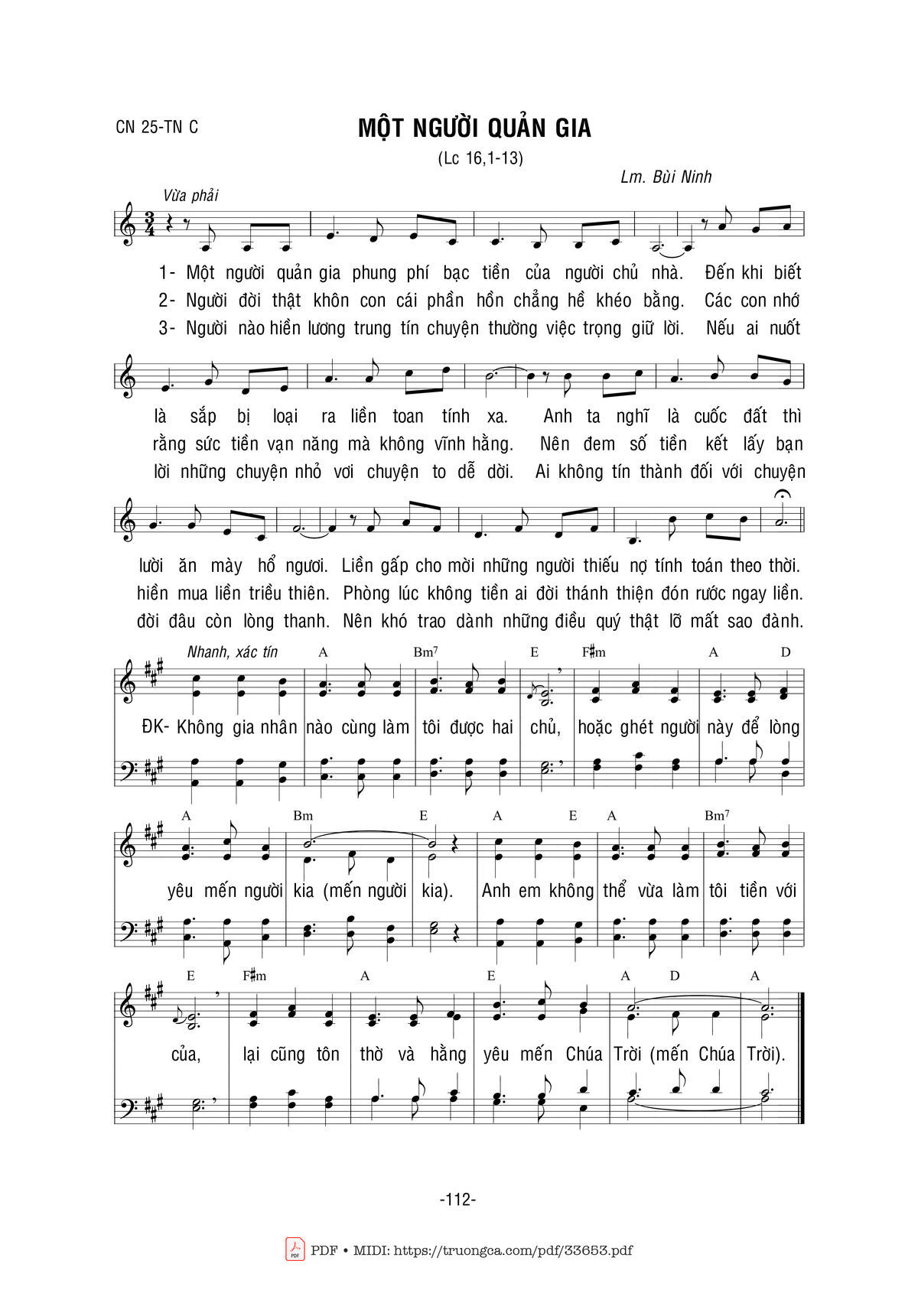 Điệp khúc: Không gia nhân nào cũng làm tôi được hai chủ, hoặc ghét người này để lòng yêu mến người kia . Anh em không thể vừa làm tôi tiền với của, lại cũng tôn thờ và hằng yêu mến Chúa Trời .