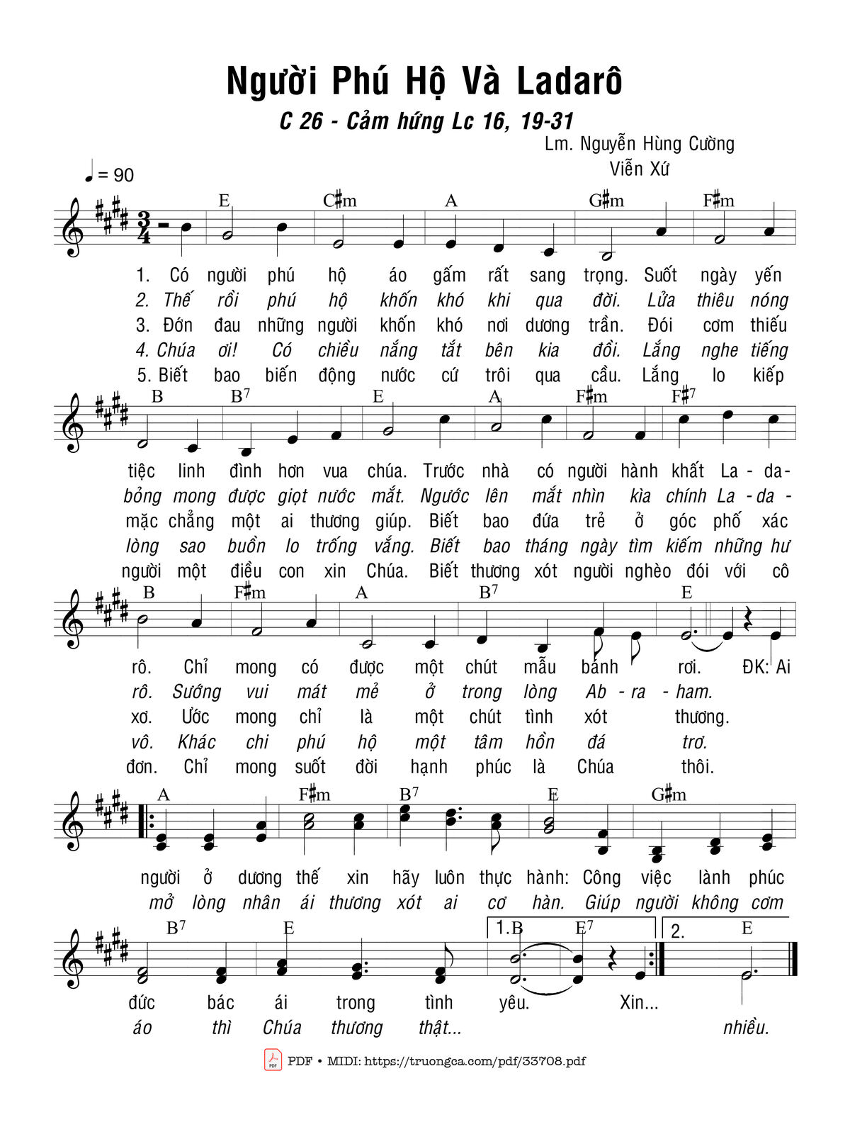 1. Có người phú hộ áo gấm rất sang trọng. Suốt ngày yến tiệc linh đình hơn vua chúa. Trước nhà có người hành khất La-da-rô. Chỉ mong có được một chút mẩu bánh rơi.