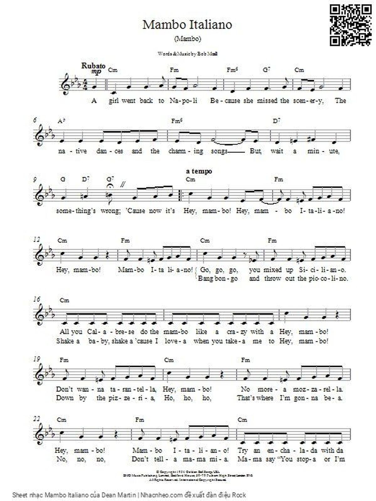 The Videos/audios Mambo Italiano by Dean Martin were embed from Youtube, Musescore or the other 3rd links. Videos are subject to 3rd's copyright control and may be removed by YouTube's copyright rules and 3rd's policies or maybe included advertisements. If you cannot access to these songs, this mean that have been removed.