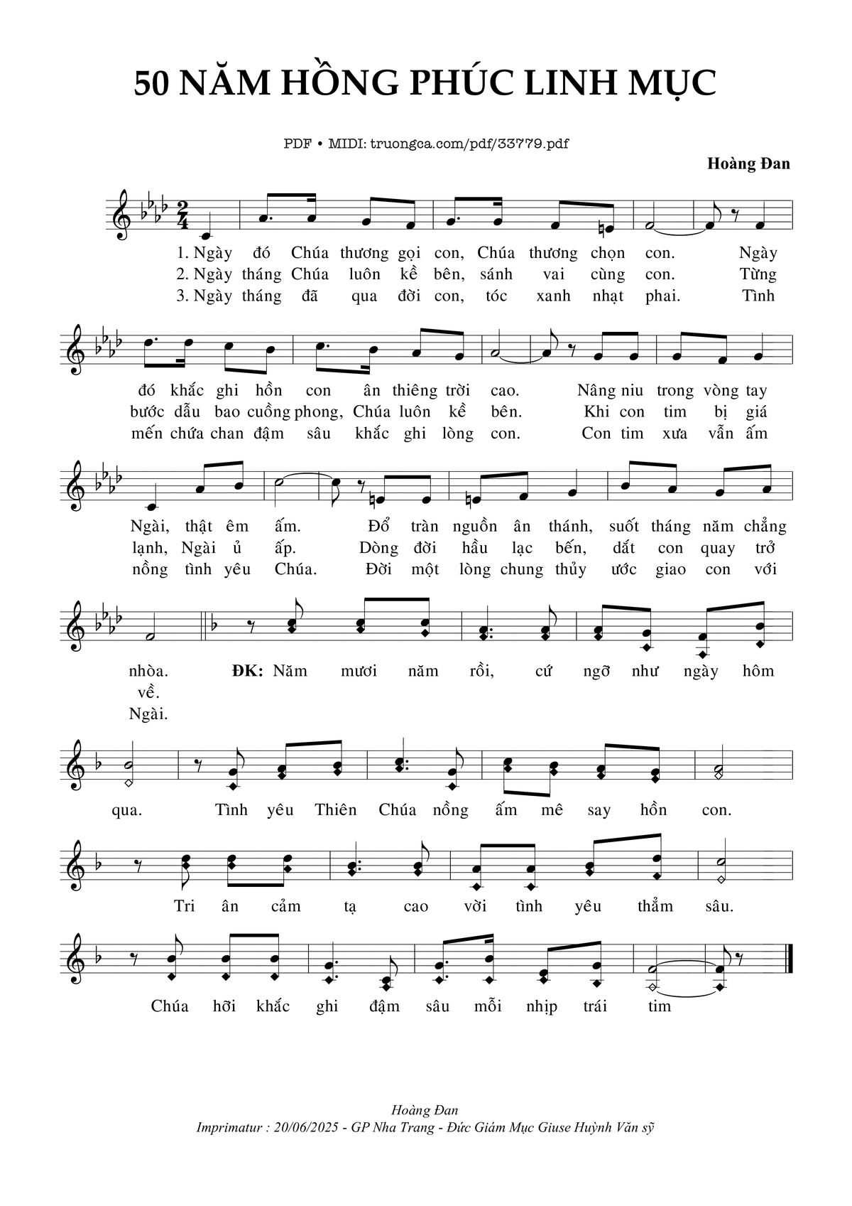 Transposition is the process of moving a song's melody and chords up or down in pitch by a constant interval. The direction of the transposition tool is indicated by a plus (+) sign for up and a minus (-) sign for down. Hover mouse over chords signs to see the chords chart of 50 Năm Hồng Phúc Linh Mục song.