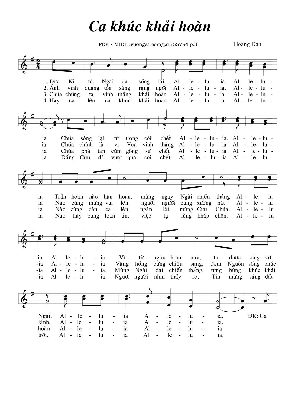 4/ Hãy ca lên ca khúc khải hoàn (Al-lê-lu-ia, Al-lê-lu-ia) Đấng Cứu độ vượt qua cõi chết (Al-lê-lu-ia , Al-lê-lu-ia) Nào hãy cùng loan tin, việc lạ lùng khắp chốn (Al-lê-lu-ia , Al-lê-lu-ia) Người người nhìn thấy rõ, tin mừng sáng đất trời (Al-lê-lu-ia , Al-lê-lu-ia)
