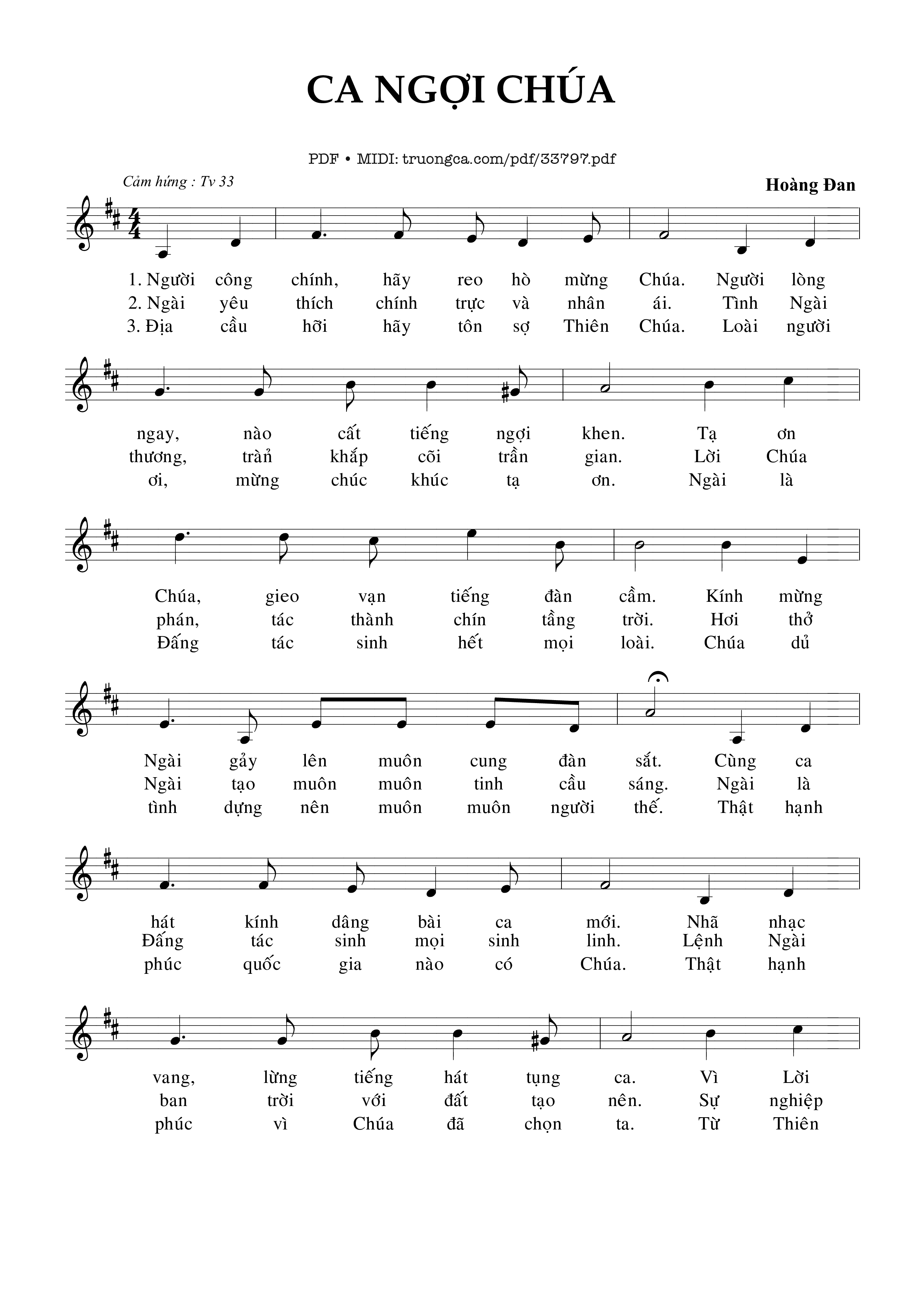 1. Người công chính hãy reo hò mừng Chúa. Người lòng ngay nào cất tiếng ngợi khen. Tạ ơn Chúa, gieo vạn tiếng đàn cầm. Kính mừng Ngài gảy lên muôn cung đàn sắt. Cùng ca hát, kính dâng bài ca mới. Nhã nhạc vang, lừng tiếng hát tụng ca. Vì Lời Chúa rất ngay chính vững bền. Những việc Ngài thật quá ư vĩ đại.