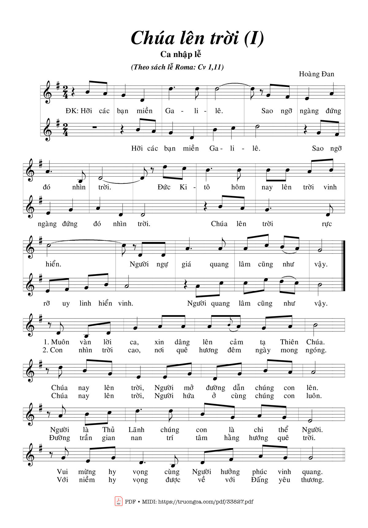 Điệp khúc: Hỡi các bạn miền Ga-li-lê. Sao ngỡ ngàng đứng đó nhìn trời Đức Ki-tô, hôm nay lên trời vinh hiển. Sẽ ngự giá quang lâm cũng như vậy