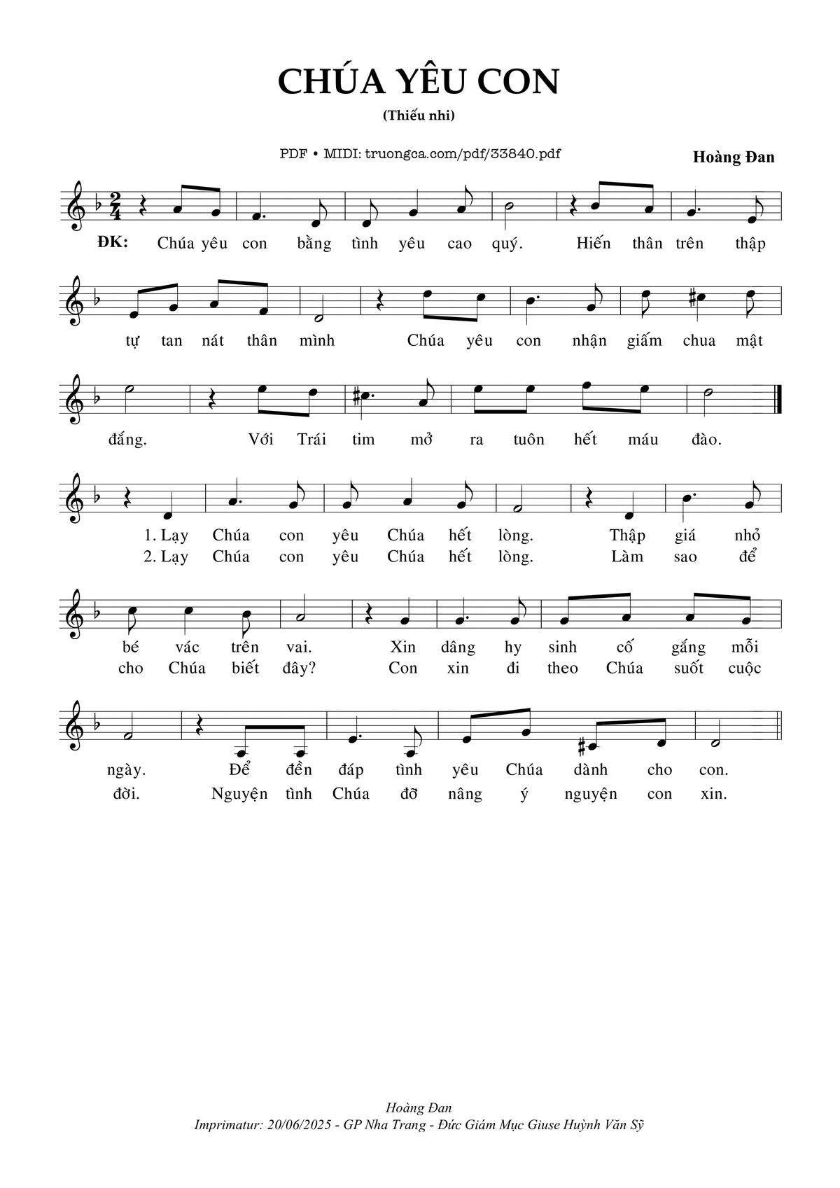 Điệp khúc: Chúa yêu con, bằng tình yêu cao quý. Hiến thân trên thập tự tan nát thân mình. Chúa yêu con, nhận giấm chua mật đắng. Với trái tim mở ra tuôn hết máu đào.
