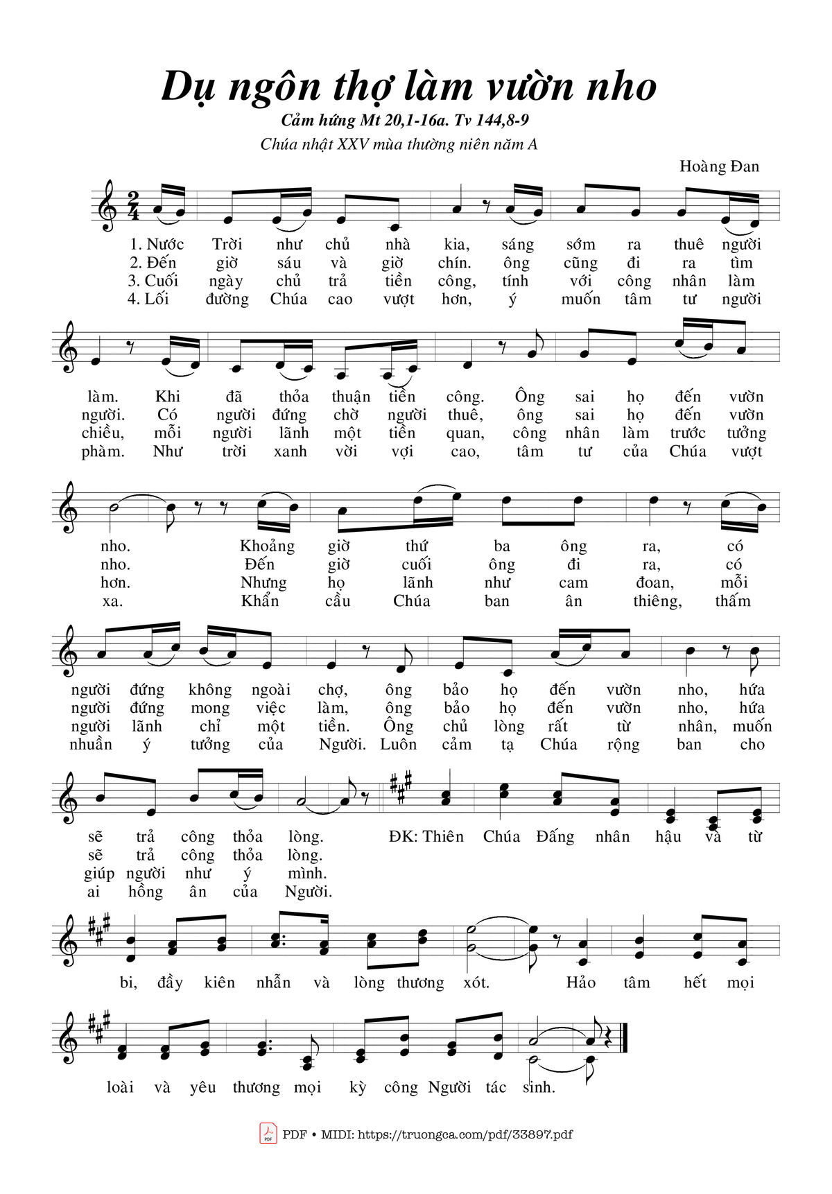 Transposition is the process of moving a song's melody and chords up or down in pitch by a constant interval. The direction of the transposition tool is indicated by a plus (+) sign for up and a minus (-) sign for down. Hover mouse over chords signs to see the chords chart of Dụ Ngôn Vườn Nho Và Hai Người Con song.