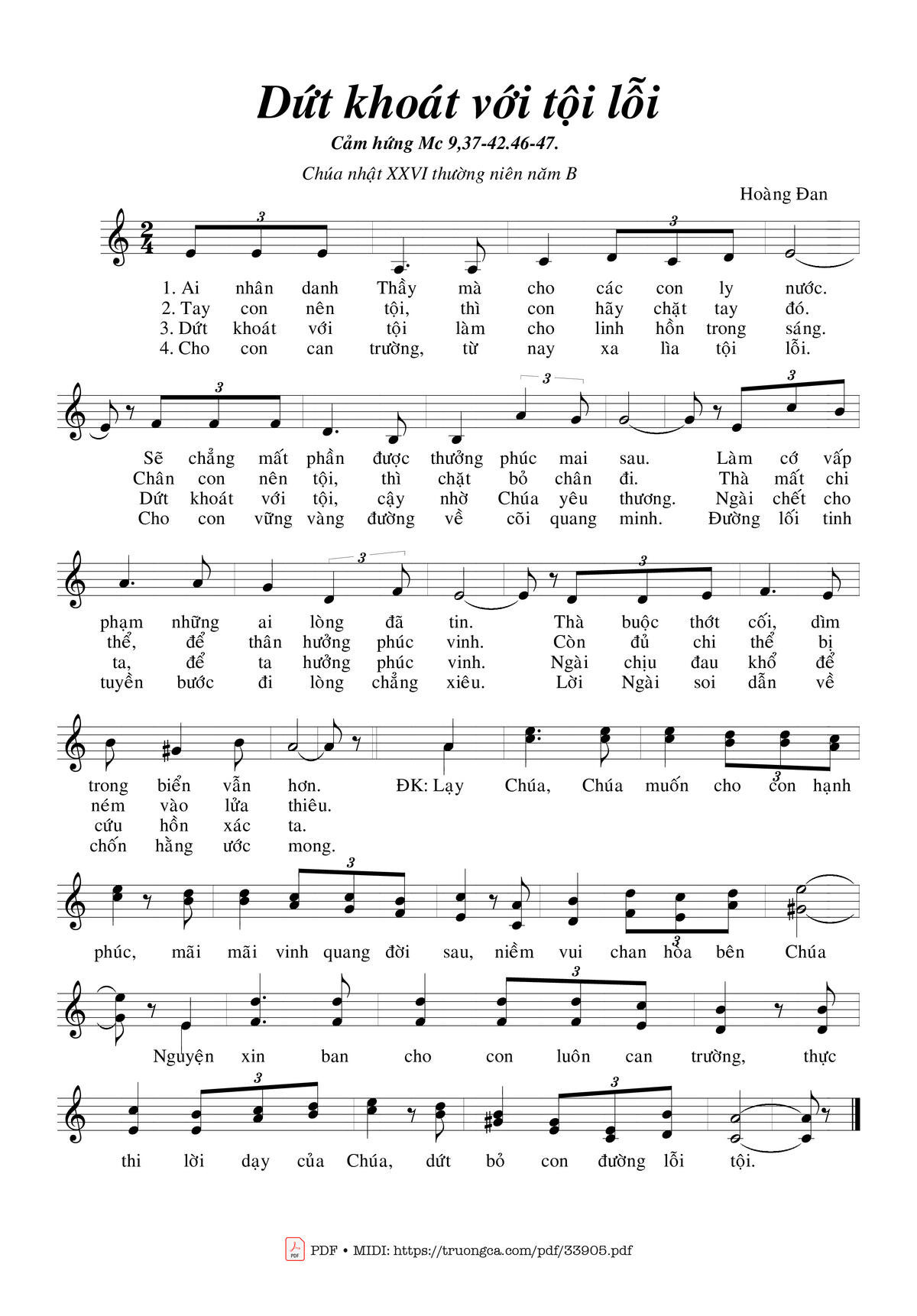 3. Dứt khoát với tội làm cho linh hồn trong sáng. Dứt khoát với tội, cậy nhờ Chúa yêu thương. Ngài chết cho ta để ta hưởng phúc vinh. Ngài chịu đau khổ để cứu hồn xác ta.