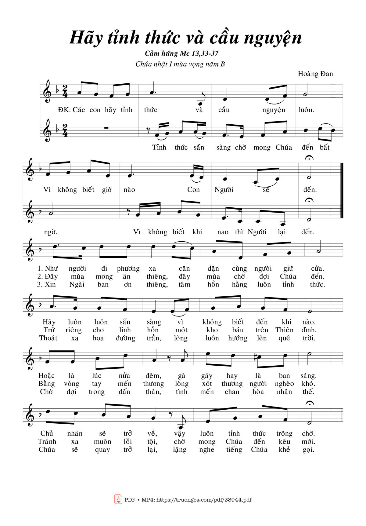 Điệp khúc: Các con hãy tỉnh thức và cầu nguyện luôn. Vì không biết giờ nào, Con Người sẽ đến