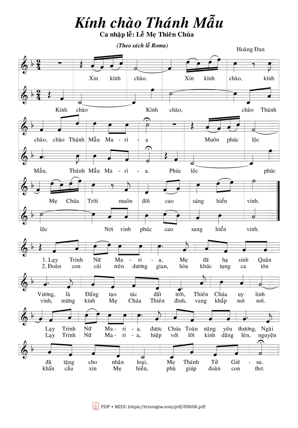 Điệp khúc : Xin kính chào. Xin kính chào, kính chào, chào Thánh Mẫu Ma-ri-a.