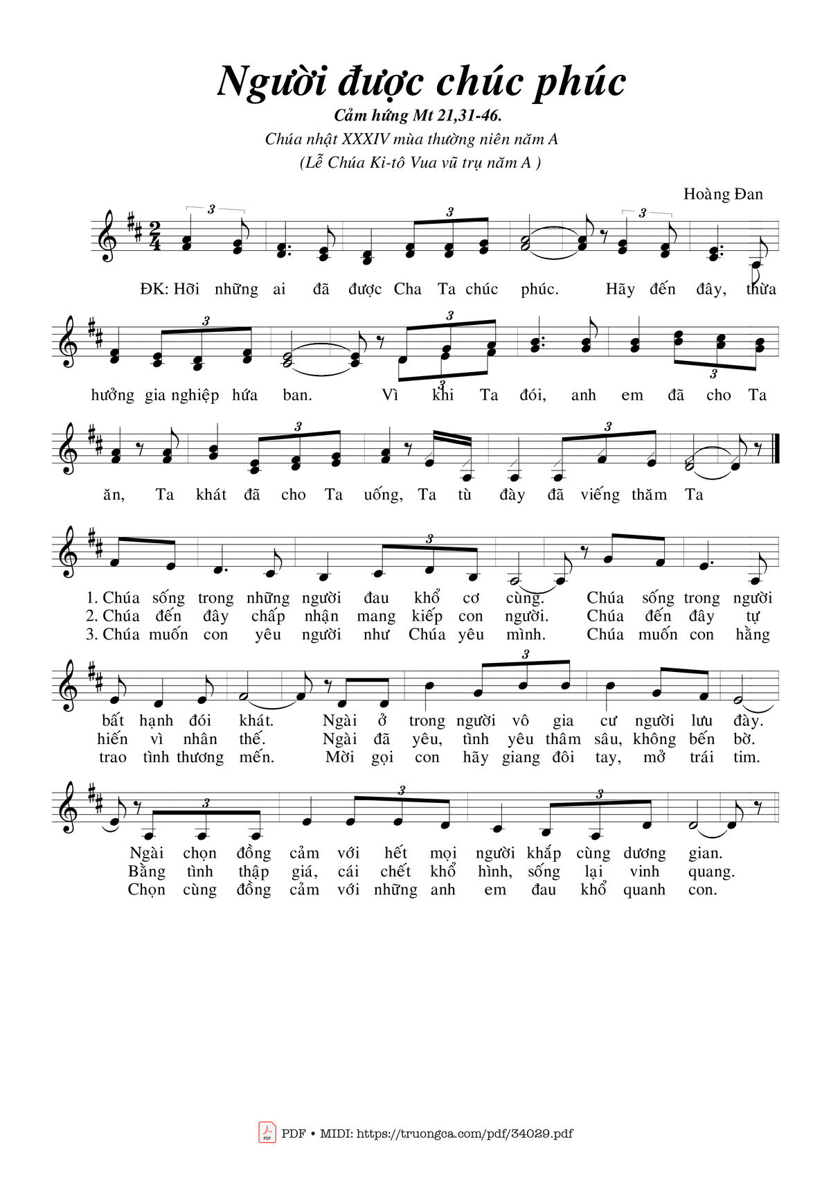 Điệp khúc: Hỡi những ai đã được Cha Ta chúc phúc. Hãy đến đây thừa hưởng gia