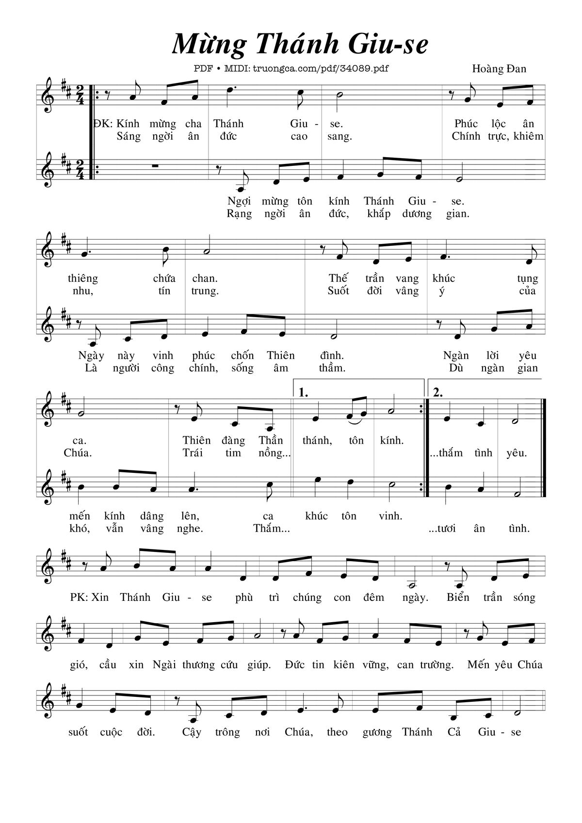 Sheet music Mừng Thánh Giuse by Hoàng Đan and PDF file was posted here to support you to practice singing perfectly. Sheets with notes and chords are for reference only, for non-commercial purposes only, not involved with earning money by buying and selling. Copyright is belong to song writer/author and copyright owner. Truongca.com do not own any copyrighted content. You can download the high-quality PDF files which contain staffs by PDF link above.