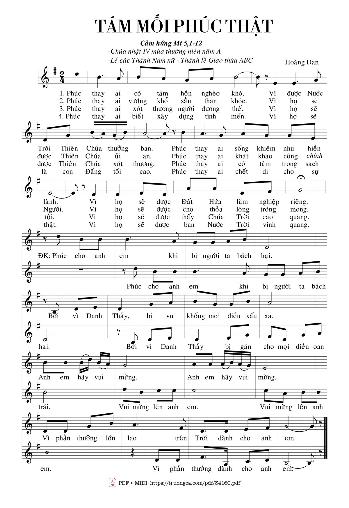 1. Phúc thay ai có tâm hồn nghèo khó. Vì được Nước Trời Thiên Chúa thưởng ban. Phúc thay ai sống khiêm nhu hiền lành. Vì họ sẽ được Đất hứa làm nghiệp riêng.
