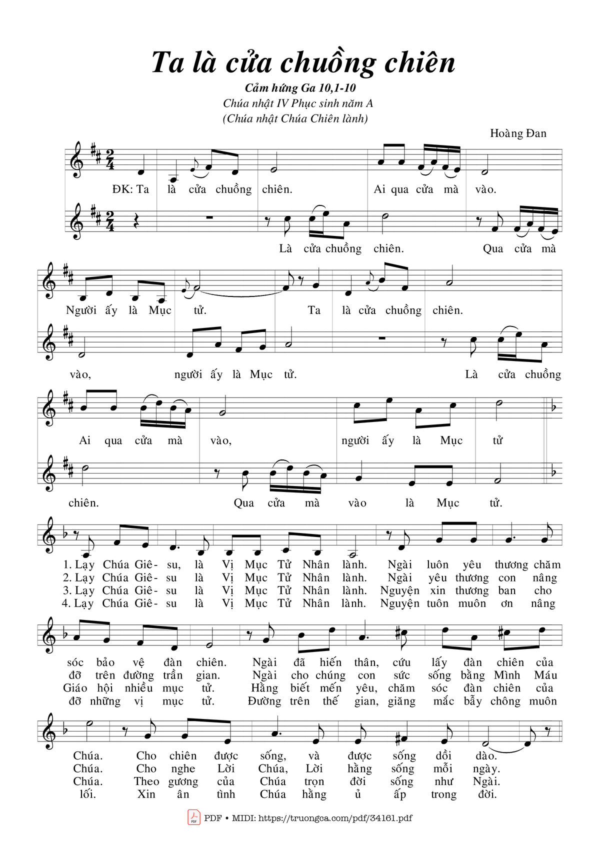 Điệp khúc: Ta là cửa chuồng chiên. Ai qua cửa mà vào. Người ấy là mục tử. Ta là cửa chuồng chiên. Ai qua cửa mà vào. Người ấy là mục tử.