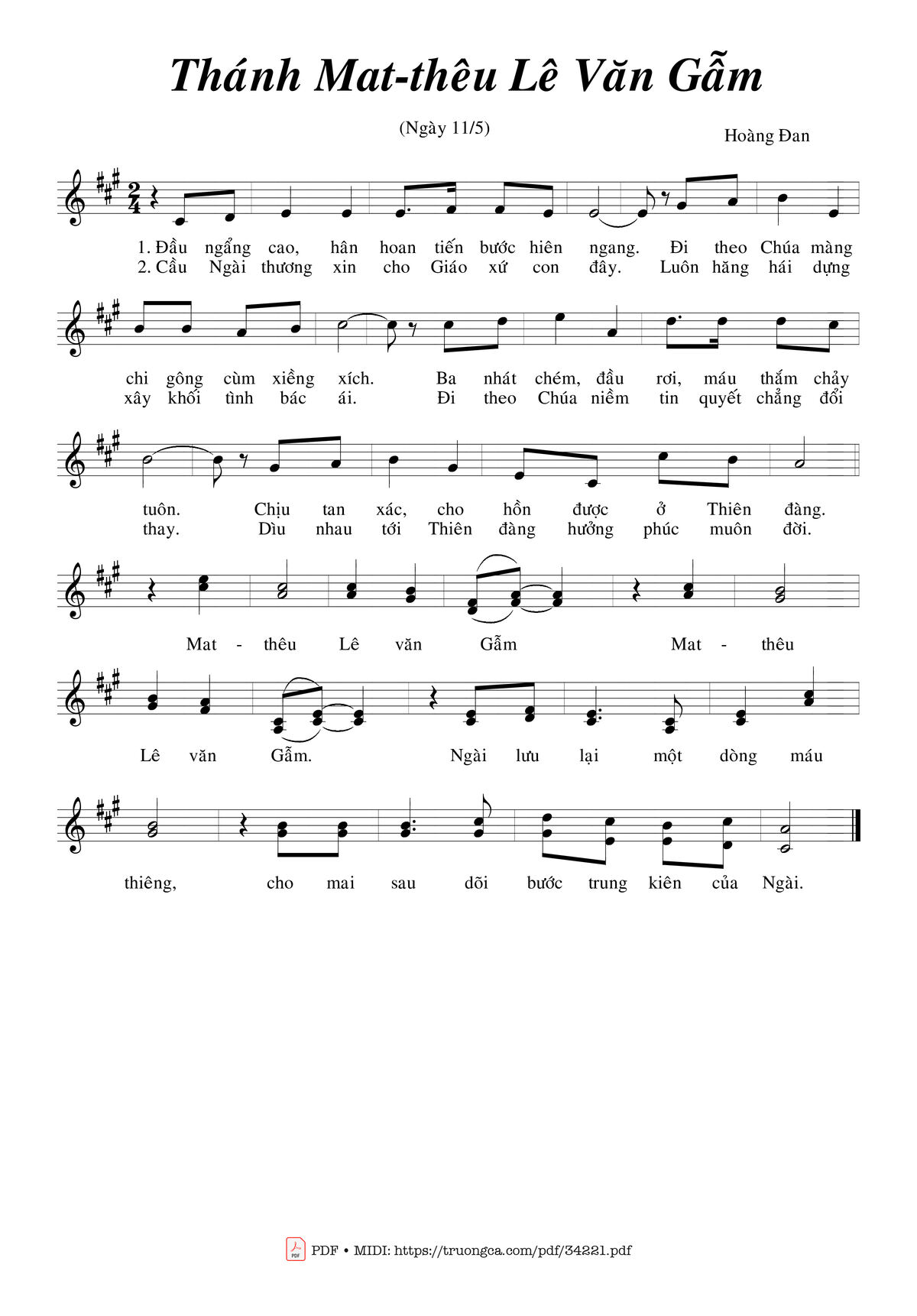 Điệp khúc: Mat-thêu Lê Văn Gẫm. Mat-thêu Lê Văn Gẫm. Ngài lưu lại một dòng máu thiêng. Cho mai sau dõi bước kiên trung của Ngài.