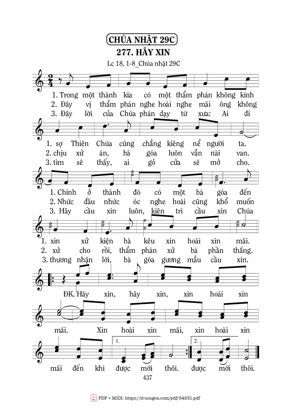 3. Đây lời của Chúa phán dạy từ xưa: Ai đi tìm sẽ thấy, ai gỏ cửa sẽ mở cho. Hãy cầu xin luôn, kiên trì cầu xin Chúa thương nhận lời, bà góa gương mẫu cầu xin.