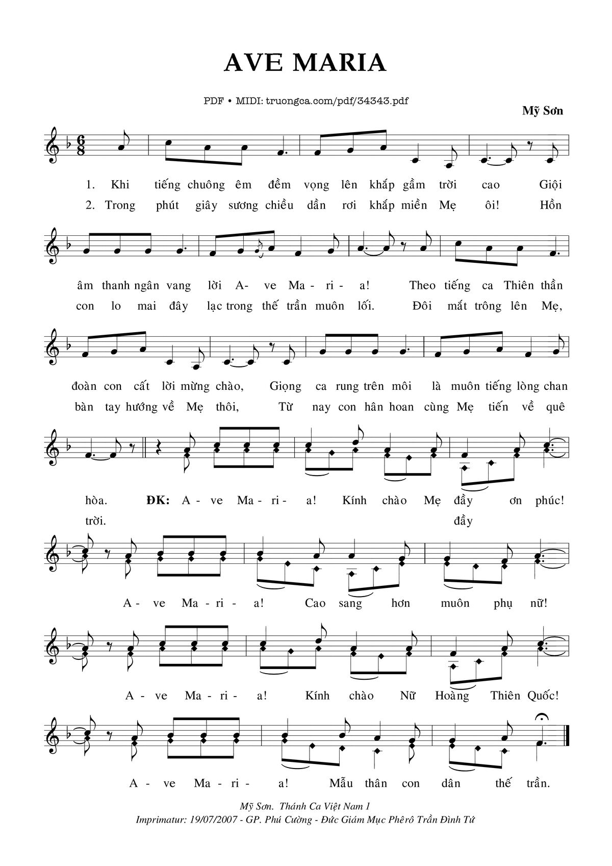 Điệp khúc. Ave Maria! Kính chào Mẹ đầy ơn phúc! Ave Maria! Cao sang hơn muôn phụ nữ! Ave Ma ria ! Kính chào Nữ Hoàng Thiên quốc! Ave Maria! Mẫu thân con dân thế trần.