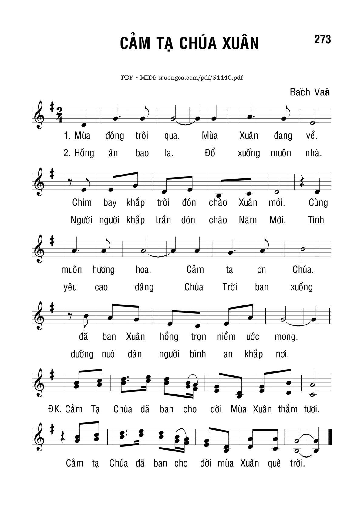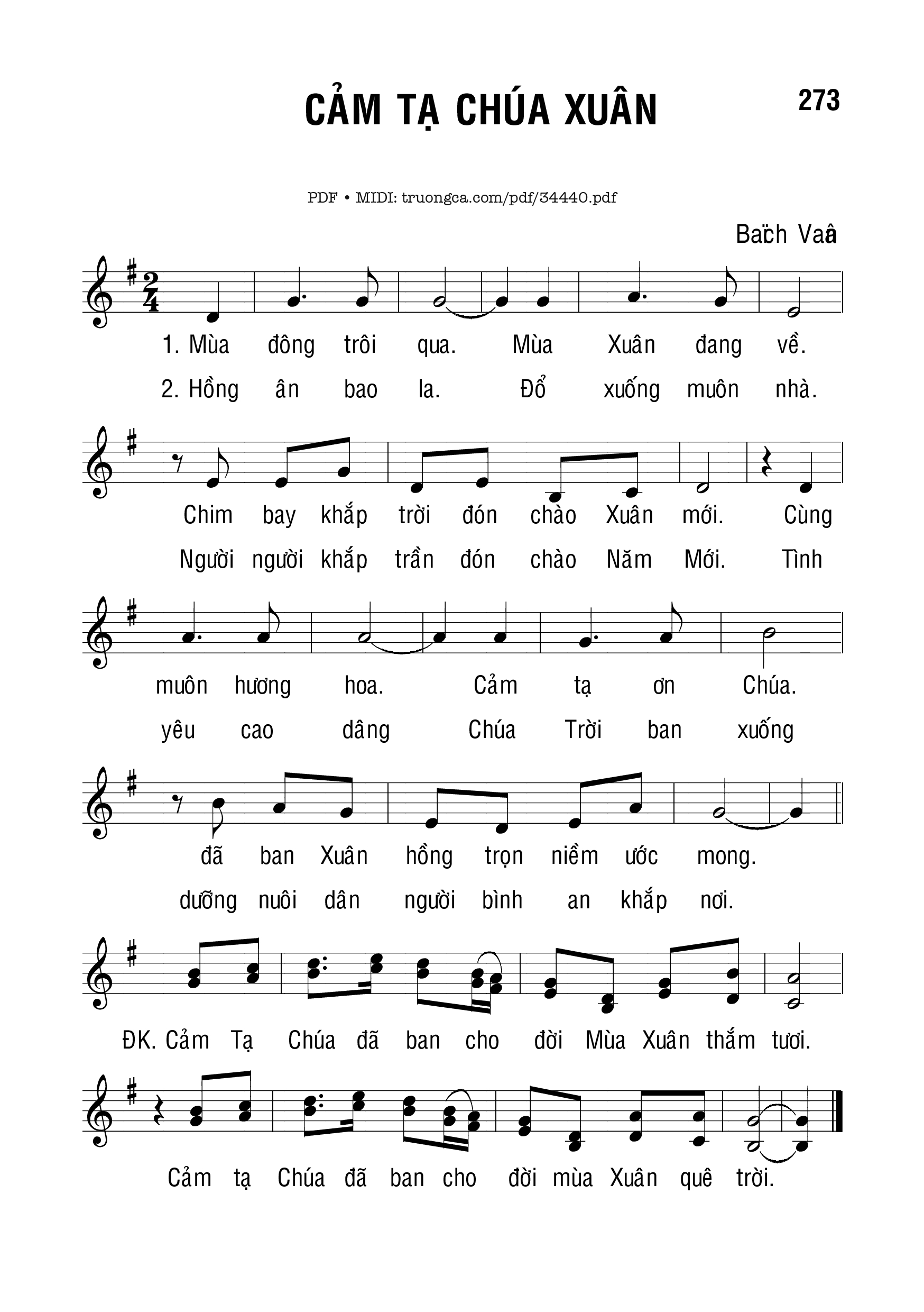 Điệp khúc: Cảm tạ Chúa đã ban cho đời mùa Xuân thắm tươi. Cảm tạ Chúa đã ban cho đời mùa Xuân quê trời.
