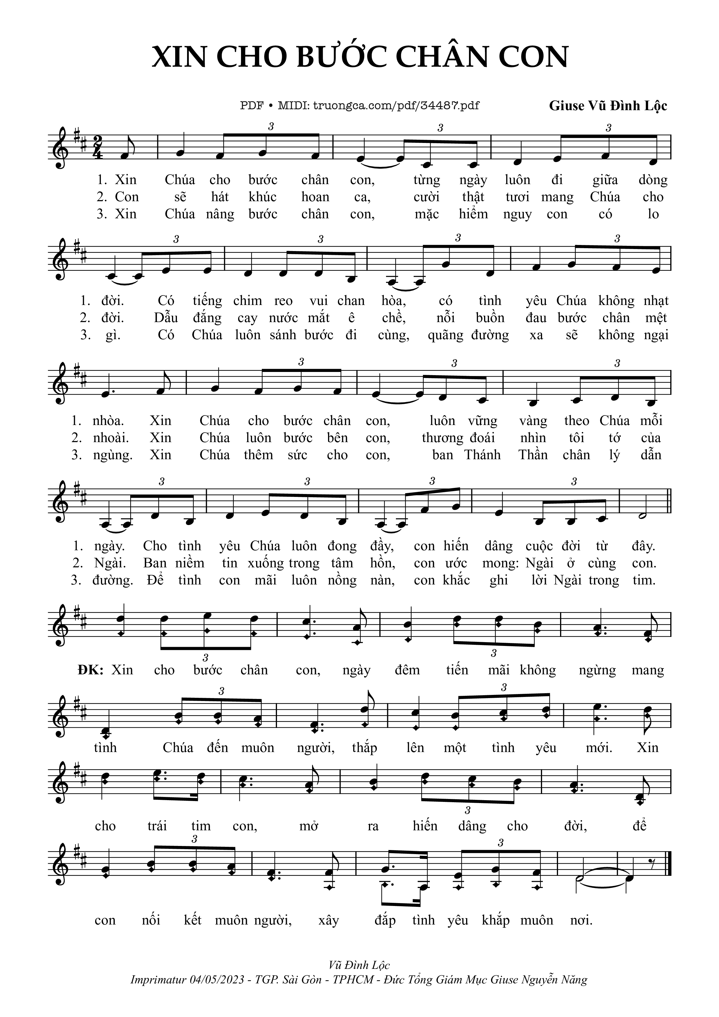 1) Xin Chúa cho bước chân con, từng ngày luôn đi giữa dòng đời. Có tiếng chim reo vui chan hòa, có tình yêu Chúa không nhạt nhòa. Xin Chúa cho bước chân con, luôn vững vàng theo Chúa mỗi ngày. Cho tình yêu Chúa luôn đong đầy, con hiến dâng cuộc đời từ đây.