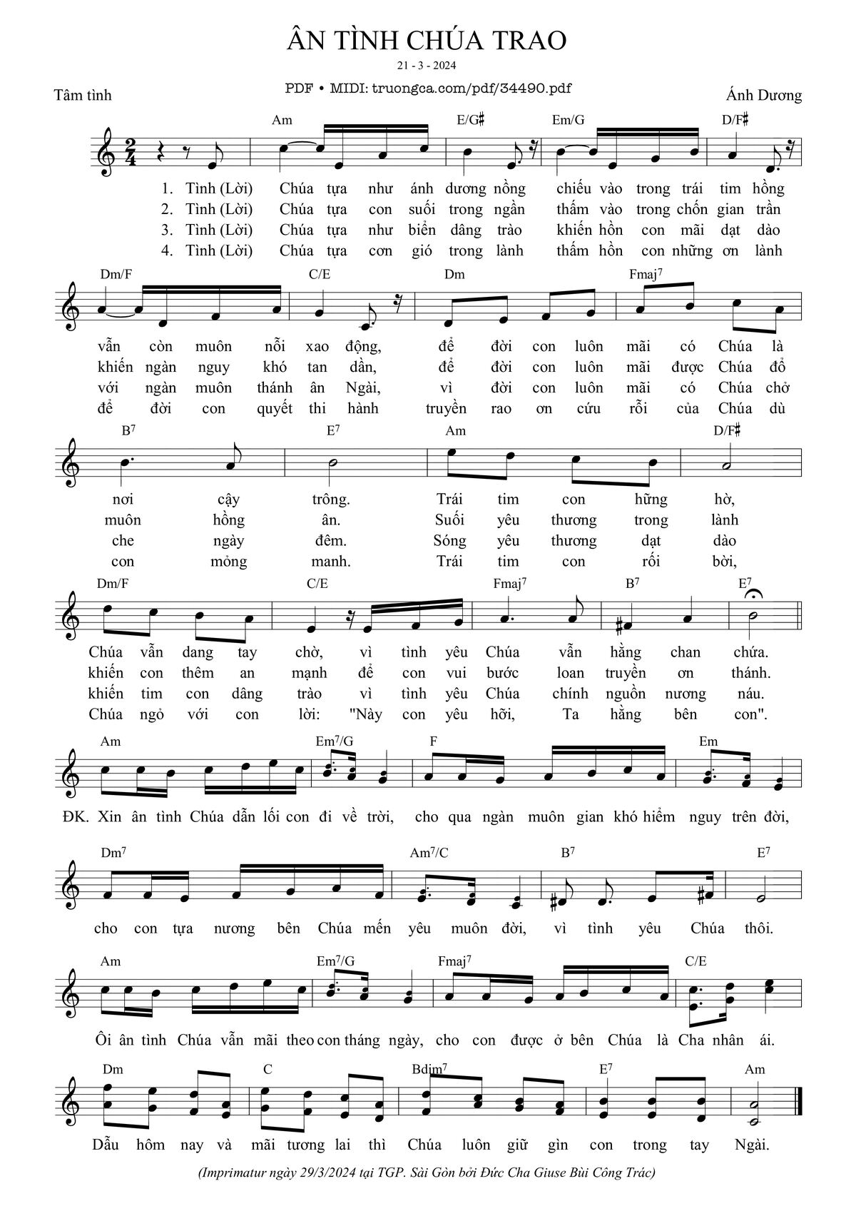 The first sentence: ÂN TÌNH CHÚA TRAO Ánh Dương Tình Chúa tựa như ánh dương nồng
