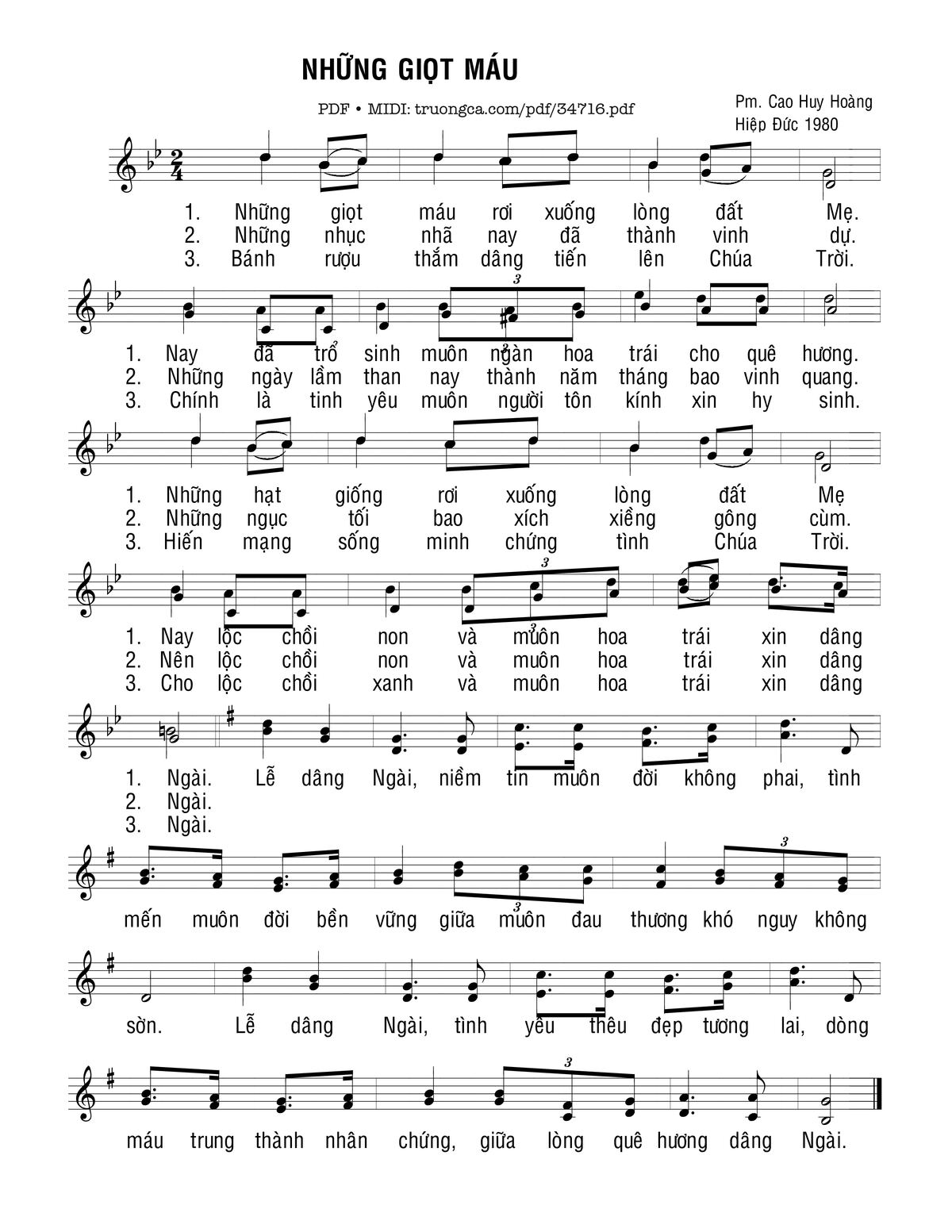 1) Những giọt máu rơi xuống lòng đất Mẹ. Nay đã trổ sinh muôn ngàn hoa trái cho quê hương. Những hạt giống rơi xuống lòng đất Mẹ. Nay lộc chồi non và muôn hoa trái xin dâng Ngài.