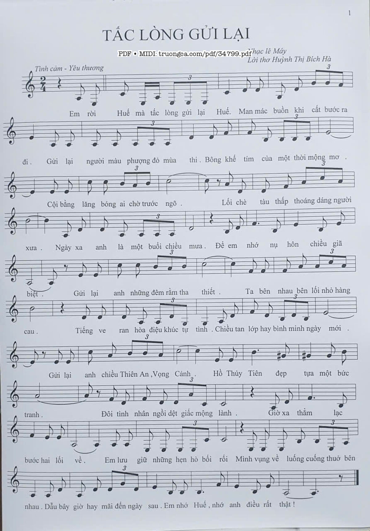 Lê Máy Em rời Huế mà tấc lòng gửi lại Man mác buồn khi cất bước ra đi [PDF] [Sheet] [Lyrics] [Mp4/Midi]