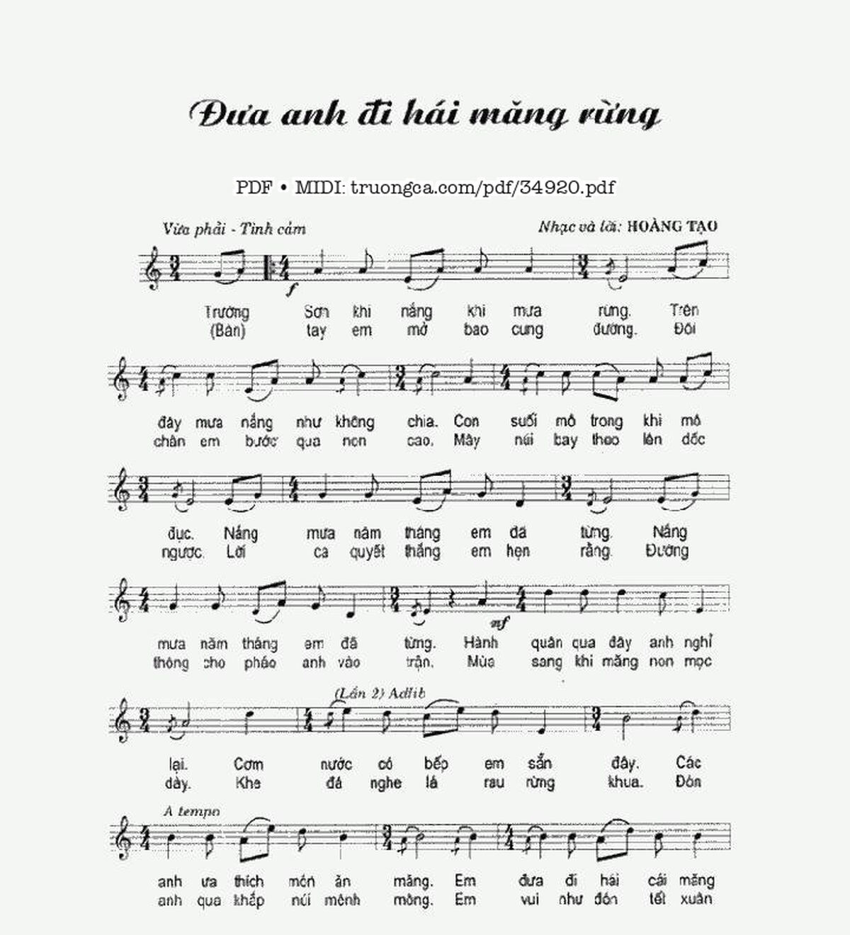 Sheet music Đưa Anh Đi Hái Măng Rừng by Hoàng Tạo and PDF file was posted here to support you to practice singing perfectly. Sheets with notes and chords are for reference only, for non-commercial purposes only, not involved with earning money by buying and selling. Copyright is belong to song writer/author and copyright owner. Truongca.com do not own any copyrighted content. You can download the high-quality PDF files which contain staffs by PDF link above.