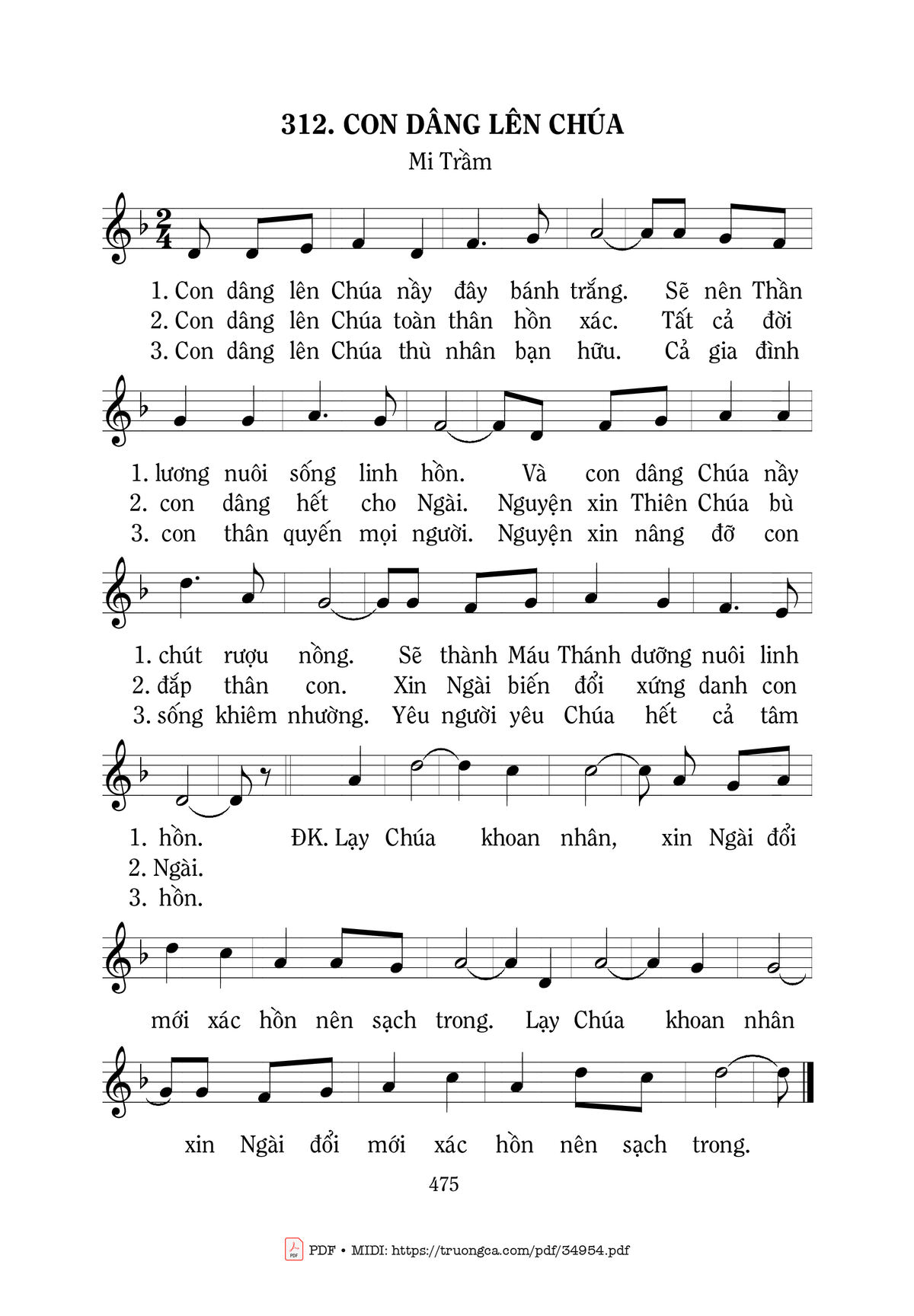 1- Con dâng lên Chúa này đây bánh trắng. Sẽ nên Thần lương nuôi sống linh hồn. Và con dâng Chúa này chút rượu nồng. Sẽ thành Máu Thánh dưỡng nuôi linh hồn.