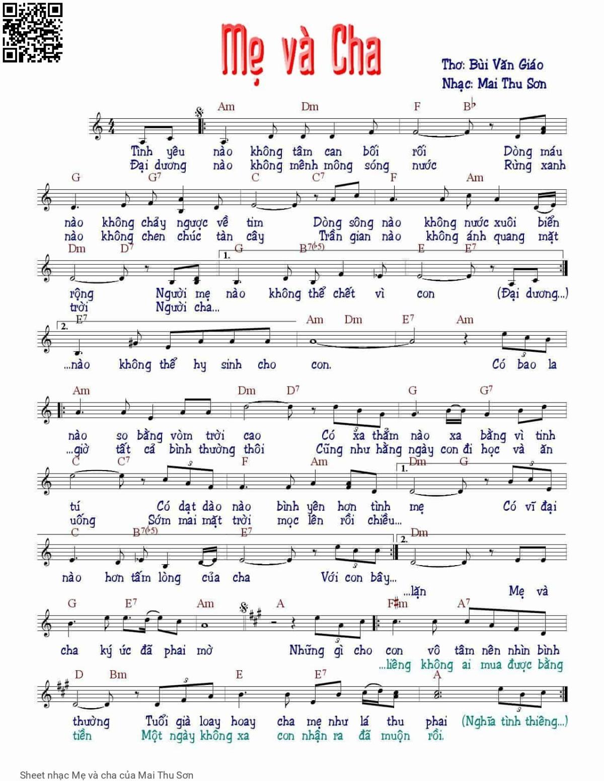 The Videos/audios Mẹ và cha by Mai Thu Sơn were embed from Youtube, Musescore or the other 3rd links. Videos are subject to 3rd's copyright control and may be removed by YouTube's copyright rules and 3rd's policies or maybe included advertisements. If you cannot access to these songs, this mean that have been removed.