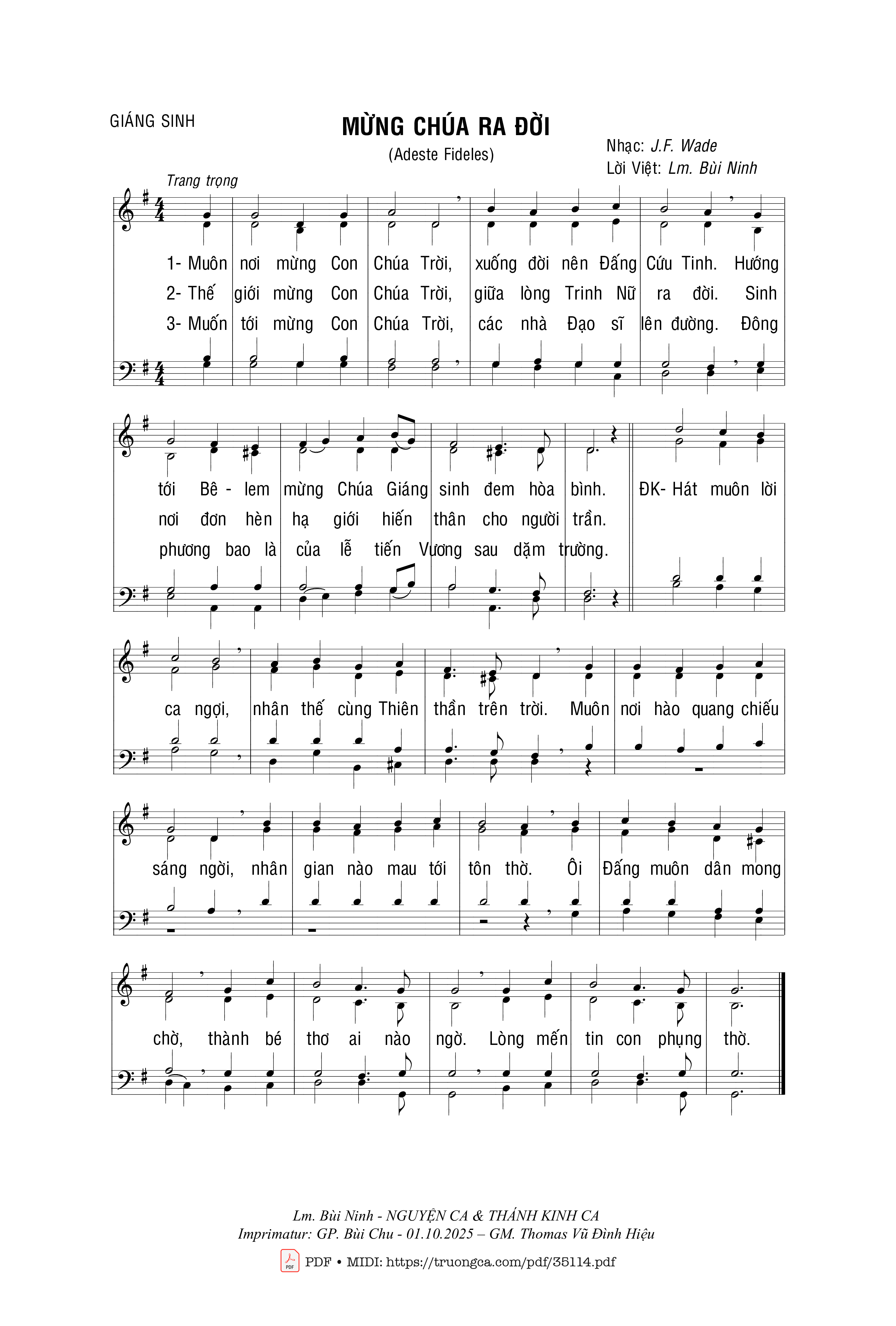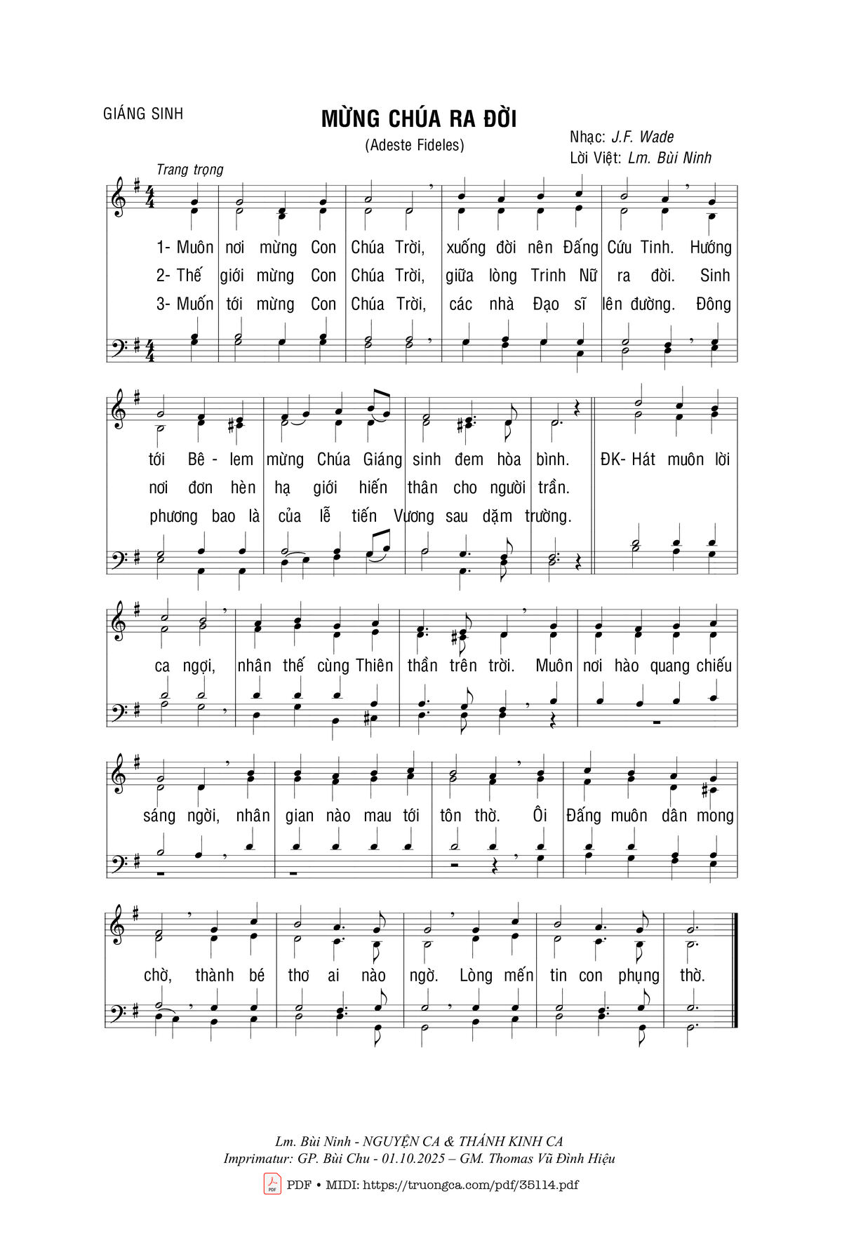 Điệp khúc: Hát muôn lời ca ngợi, nhân thế cùng Thiên thần trên trời. Muôn nơi hào quang chiếu sáng ngời, nhân gian nào mau tới tôn thờ. Ôi Đấng muôn dân mong chờ, thành bé thơ ai nào ngờ. Lòng mến tin con phụng thờ.