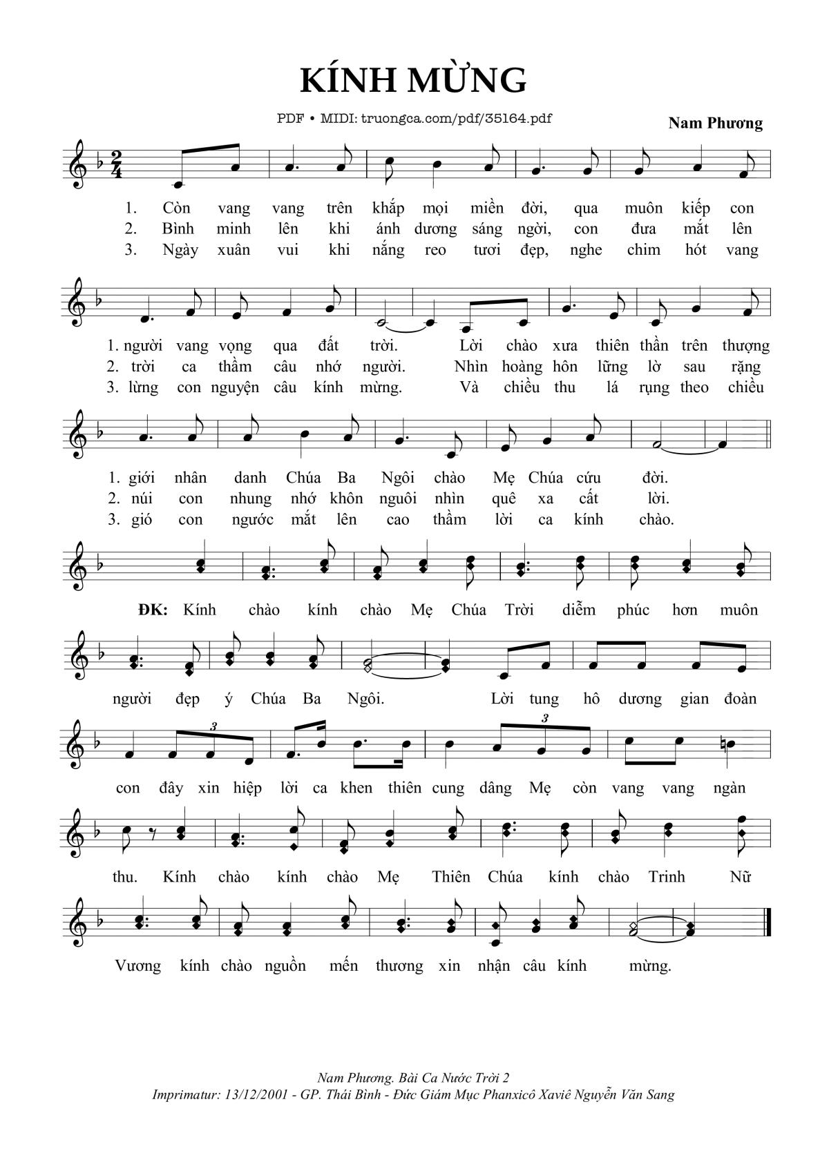 Điệp khúc. Kính chào, kính chào Mẹ Chúa Trời, diễm Phúc hơn muôn người, đẹp ý Chúa Ba Ngôi. Lời tung hô dương đoàn con đây xin Hiệp lời ca khen thiên cung cung Mẹ còn vang vang ngàn thu. Kính chào, kính chào Mẹ Thiên Chúa, kính chào Trinh Nữ Vương, kính chào quý khách thương xin nhận câu kính chào.