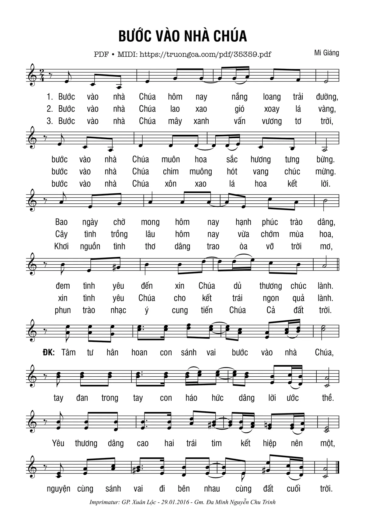 1. Bước vào nhà Chúa hôm nay nắng loang trải đường, bước vào nhà Chúa muôn hoa sắc hương tưng bừng. Bao ngày chờ mong hôm nay hạnh phúc trào dâng, đem tình yêu đến xin Chúa dủ thương chúc lành.