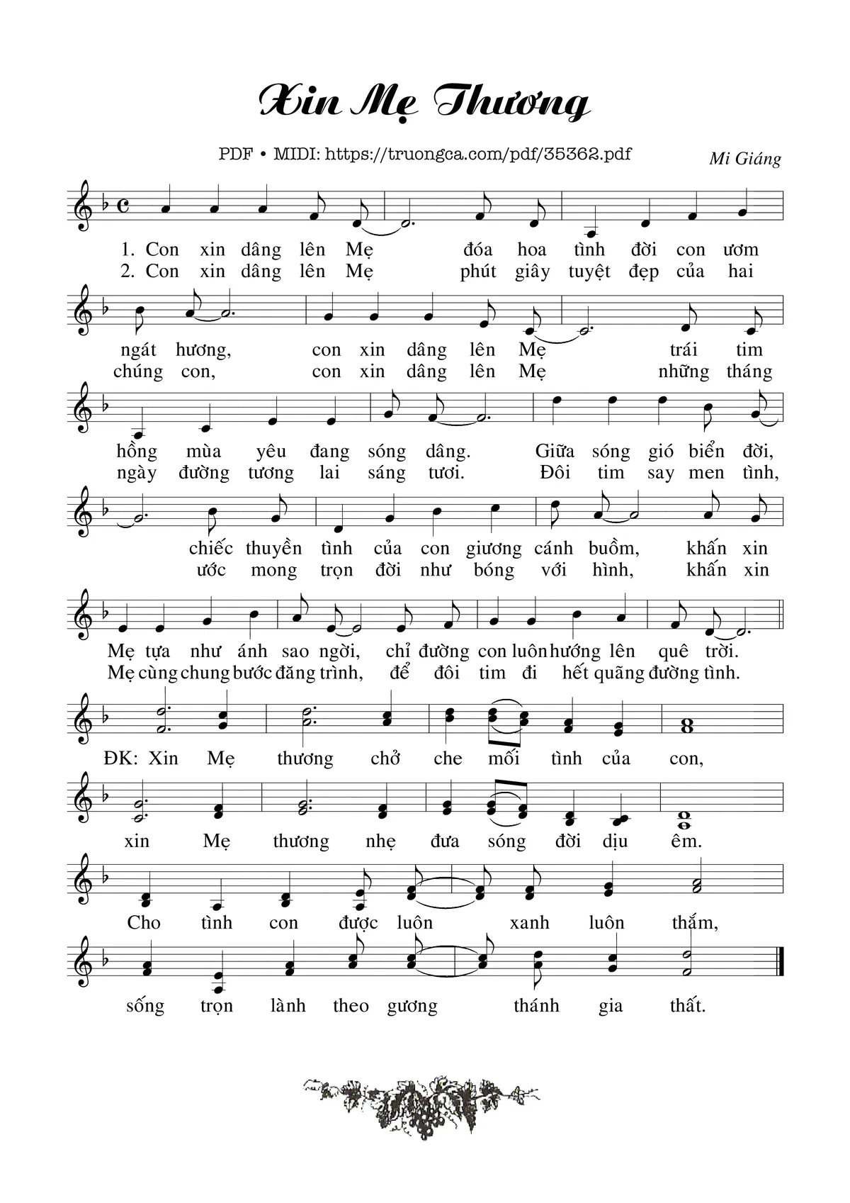 1- Con xin dâng lên Mẹ đóa hoa tình đời con ươm ngát hương, con xin dâng lên Mẹ trái tim hồng mùa yêu đang sóng dâng. Giữa sóng gió biển đời chiếc thuyền tình của con giương cánh buồn, khấn xin Mẹ tựa như ánh sao ngời, chỉ đường con luôn hướng lên quê trời.