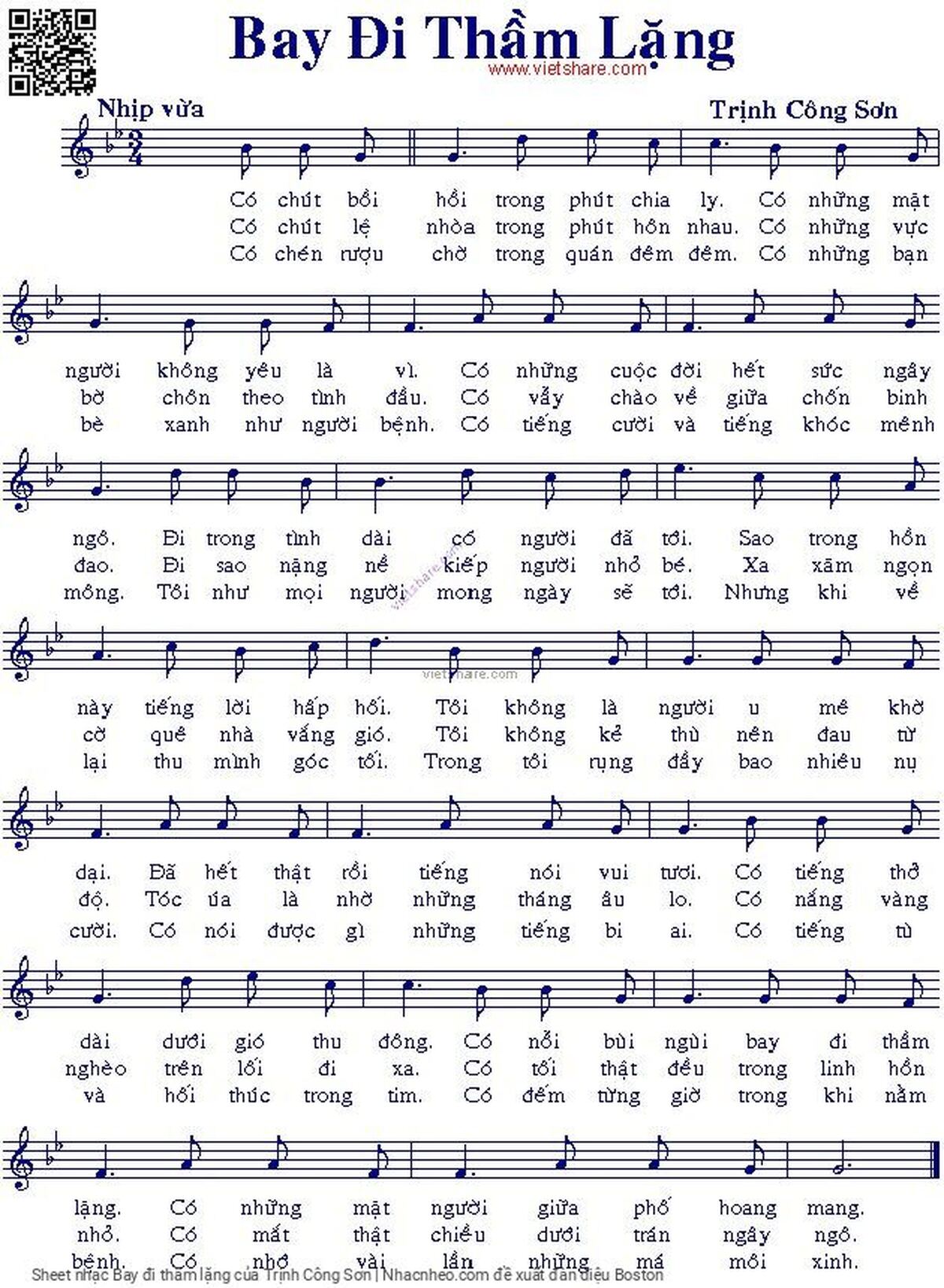 The Videos/audios Bay đi thầm lặng by Trịnh Công Sơn were embed from Youtube, Musescore or the other 3rd links. Videos are subject to 3rd's copyright control and may be removed by YouTube's copyright rules and 3rd's policies or maybe included advertisements. If you cannot access to these songs, this mean that have been removed.