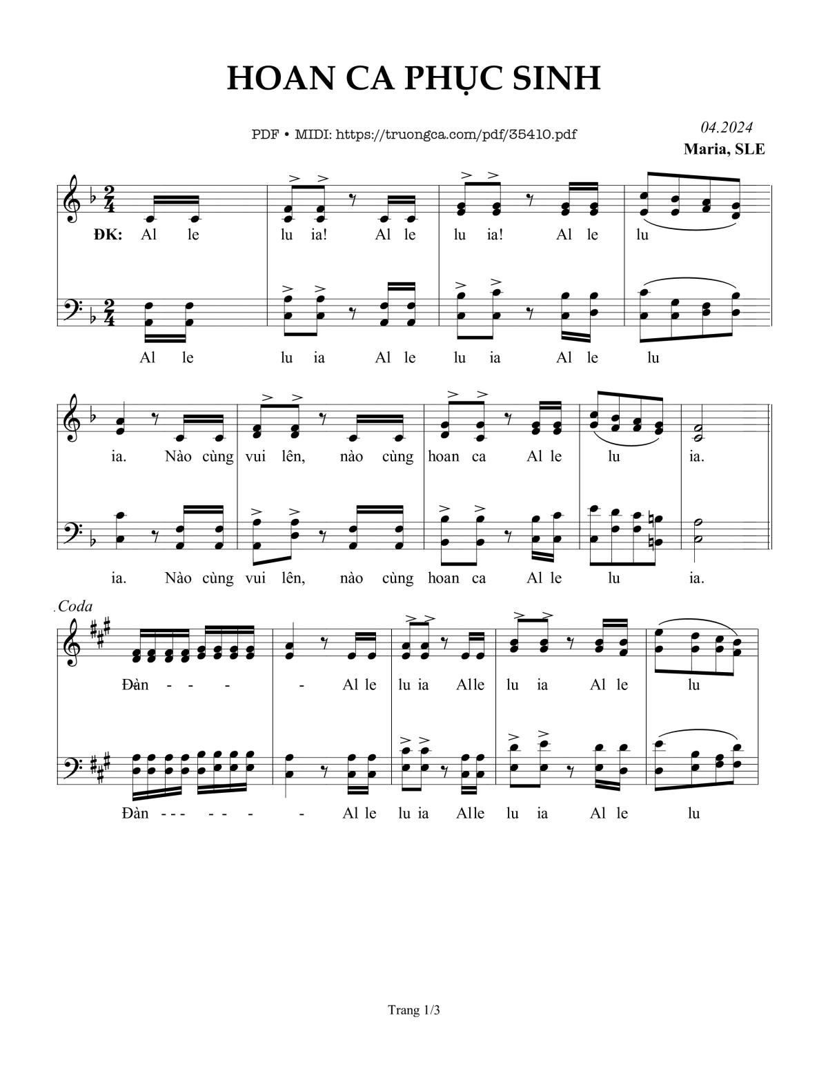 Điệp khúc. Alleluia! Alleluia! Alleluia! Nào cùng vui lên, nào cùng hoan ca. Alleluia!
