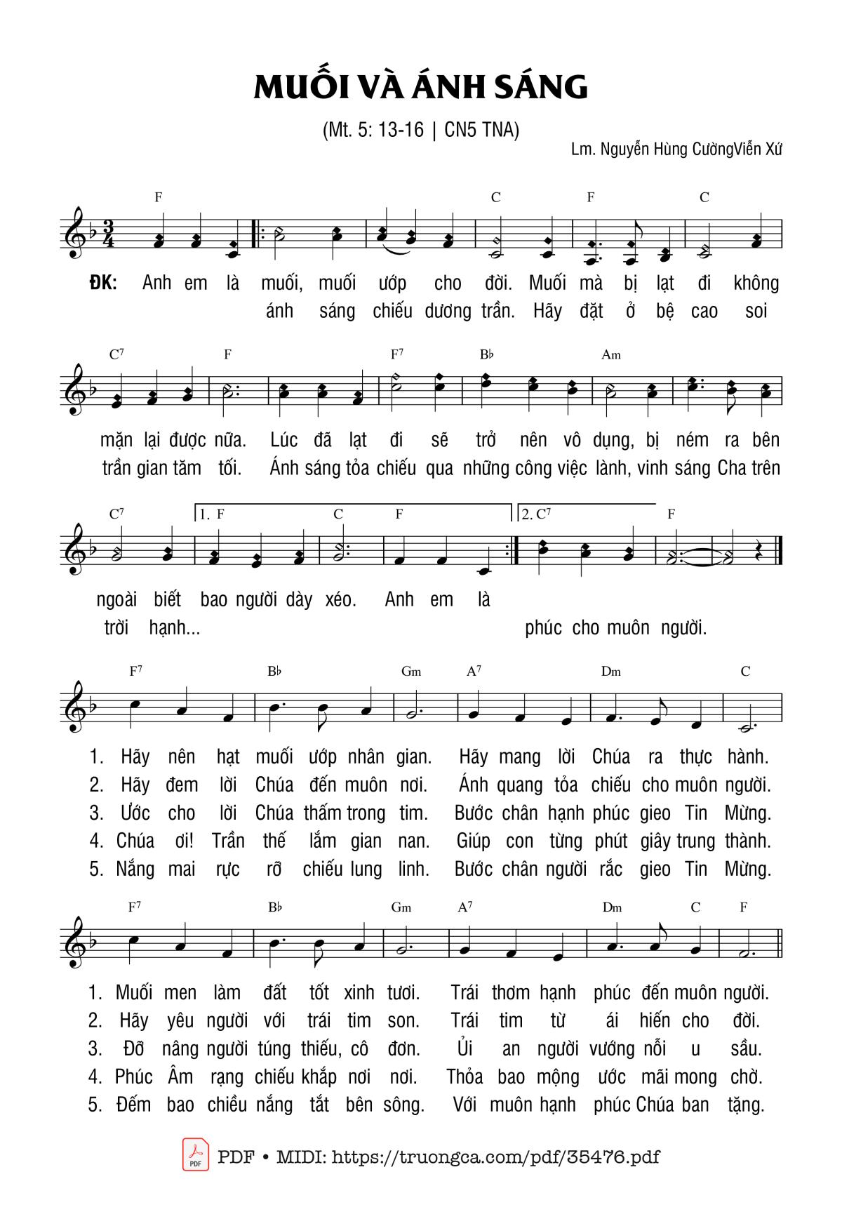 Điệp khúc: Anh em là muối, muối ướp cho đời. Muối mà bị lạt đi không mặn lại được nữa. Lúc đã lạt đi sẽ trở nên vô dụng, bị ném ra bên ngoài biết bao người dày xéo. Anh em là ánh sáng chiếu dương trần. Hãy đặt ở bệ cao soi trần gian tăm tối. Ánh sáng tỏa chiếu qua những công việc lành, vinh sáng Cha trên trời hạnh phúc cho muôn người.