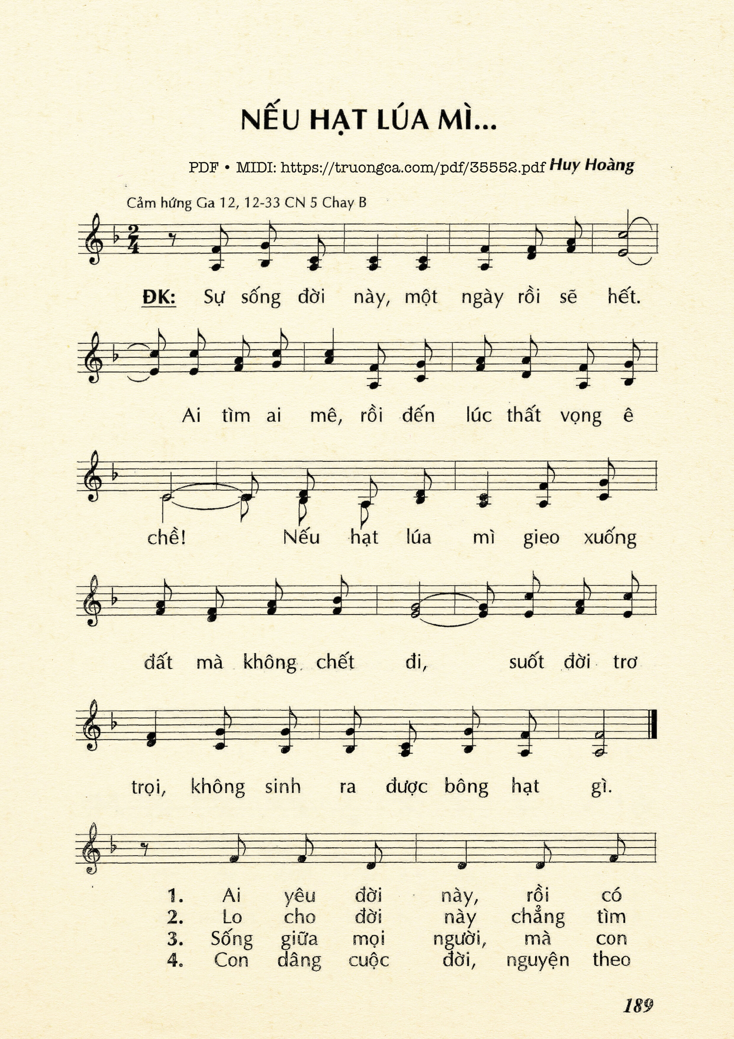Điệp khúc: Sự sống đời này, một ngày rồi sẽ hết. Ai tìm ai mê, rồi đến lúc thất vọng ê chề! Nếu hạt lúa mì gieo xuống đất mà không chết đi, suốt đời trơ trọi, không sinh ra được bông hạt gì.