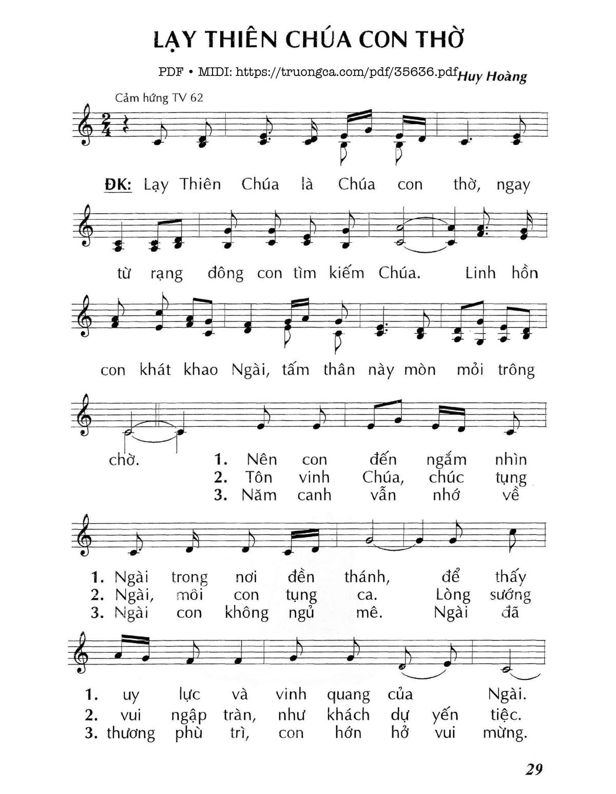 Điệp khúc: Lạy Thiên Chúa là Chúa con thờ, ngay từ rạng đông con tìm kiếm Chúa.