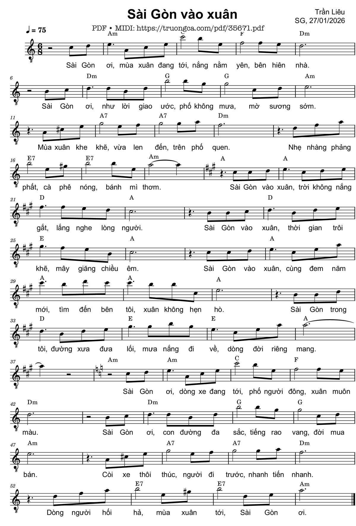 Transposition is the process of moving a song's melody and chords up or down in pitch by a constant interval. The direction of the transposition tool is indicated by a plus (+) sign for up and a minus (-) sign for down. Hover mouse over chords signs to see the chords chart of Sài Gòn vào xuân song.