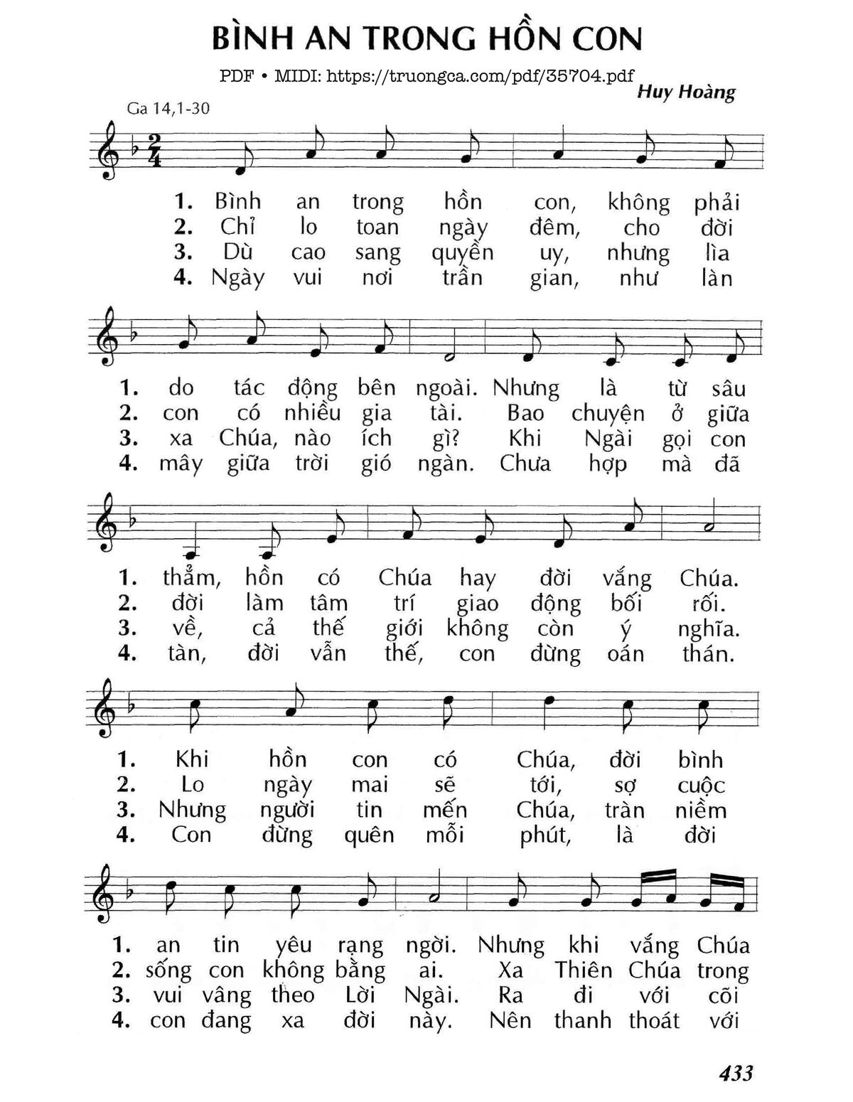1. Bình an trong hồn con, không phải do tác động bên ngoài. Nhưng là từ sâu thẳm, hồn có Chúa hay đời vắng Chúa. Khi hồn con có Chúa, đời bình an tin yêu rạng ngời. Nhưng khi vắng Chúa rồi, đời nhuốm màu nghĩa trang buồn thôi.