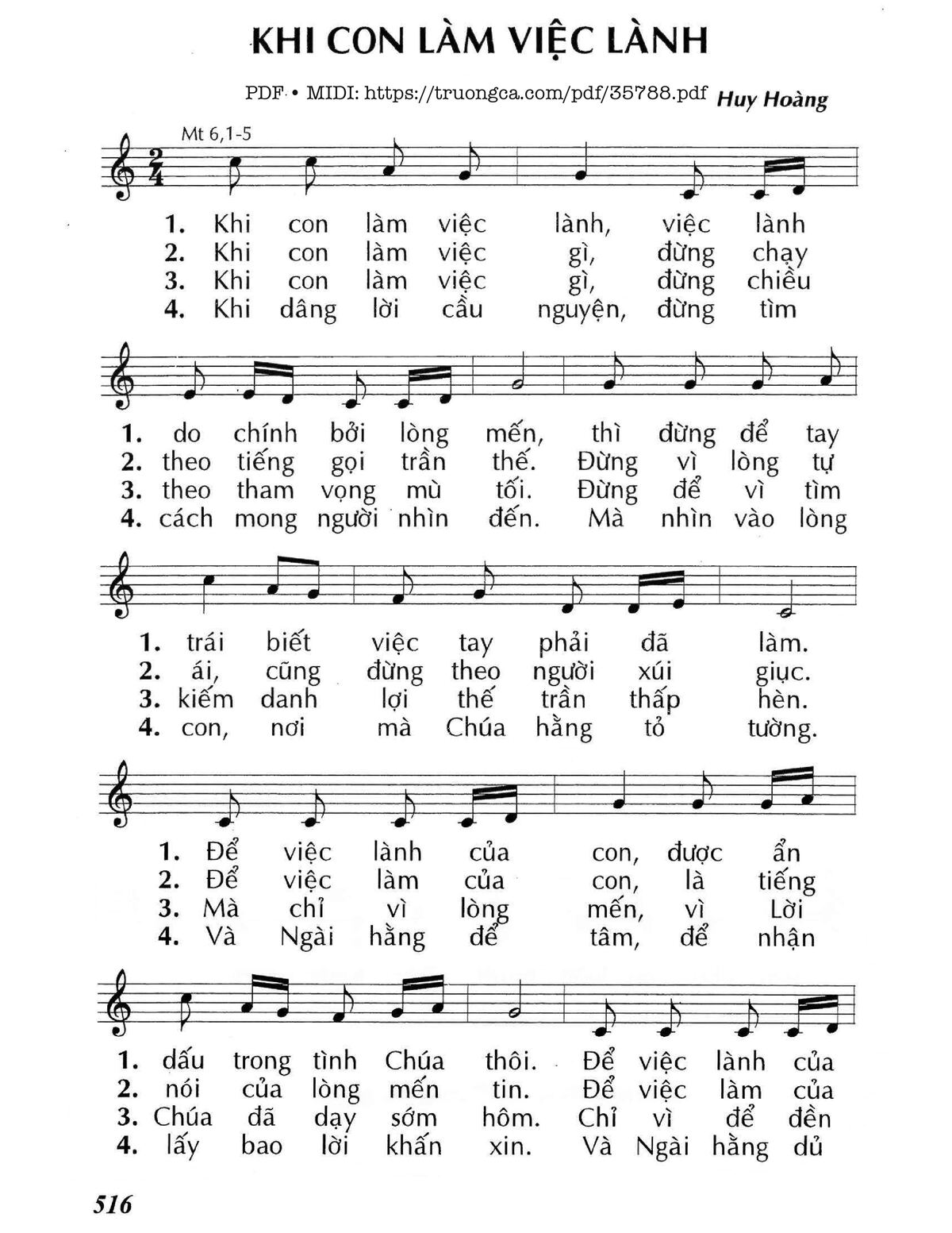 1. Khi con làm việc lành, việc lành do chính bởi lòng mến, thì đừng để tay trái biết việc tay phải đã làm. Để việc lành của con, được ẩn dấu trong tình Chúa thôi. Để việc lành của con là ơn phúc cho sự sống đời đời.