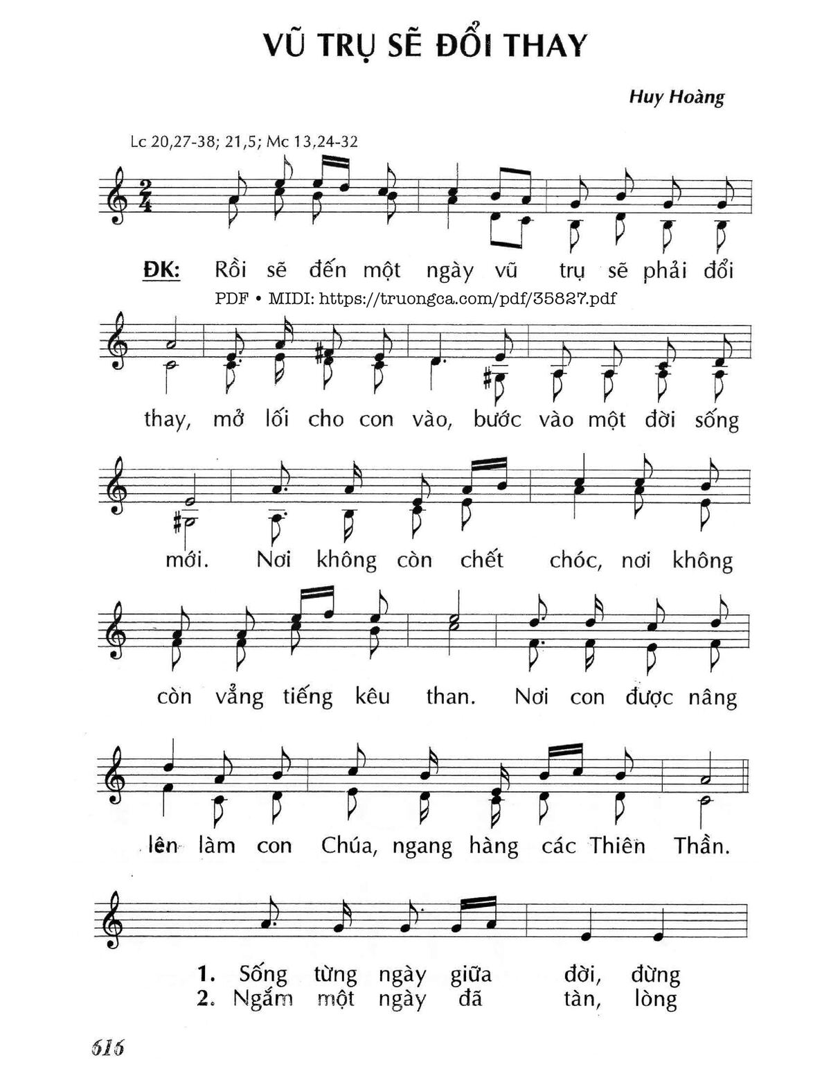Điệp khúc: Rồi sẽ đến một ngày vũ trụ sẽ phải đổi thay, mở lối cho con vào, bước vào một đời sống mới. Nơi không còn chết chóc, nơi không còn vẳng tiếng kêu than. Nơi con được nâng lên làm con Chúa, ngang hàng các Thiên Thần.