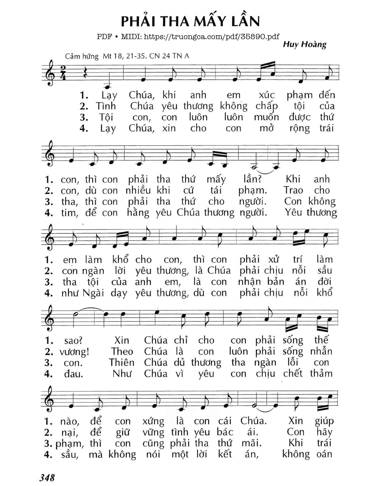 Điệp khúc: Khi anh em xúc phạm đến con, con phải tha không phải mấy lần, mà còn sống là còn tha thứ, phải tha luôn không còn để tâm. Mang thân xác mỏng manh kiếp người, vô thập toàn, nên còn lầm lỗi. Nên muốn được Ngài tha thứ tội, thì suốt đời con phải thứ tha.