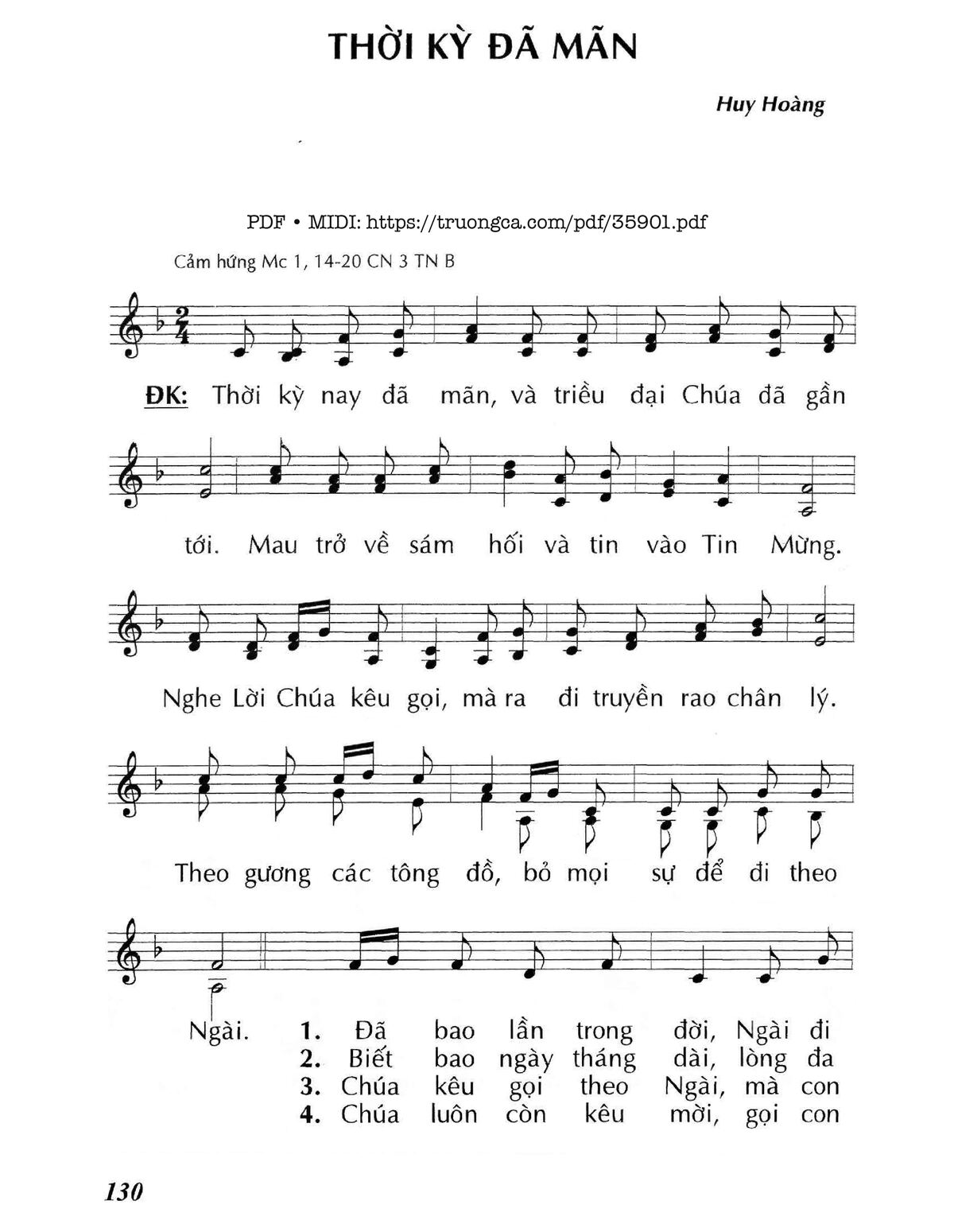 Điệp khúc: Thời kỳ này đã mãn, và triều đại Chúa đã gần tới. Mau trở về sám hối và tin vào Tin Mừng. Nghe Lời Chúa kêu gọi, mà ra đi truyền rao chân lý. Theo gương các tông đồ, bỏ mọi sự để đi theo Ngài.