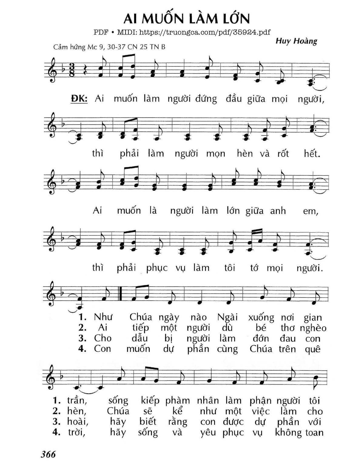 Điệp khúc: Ai muốn làm người đứng đầu giữa mọi người, thì phải làm người mọn hèn và rốt hết. Ai muốn là người làm lớn giữa anh em, thì phải phục vụ làm tôi tớ mọi người.