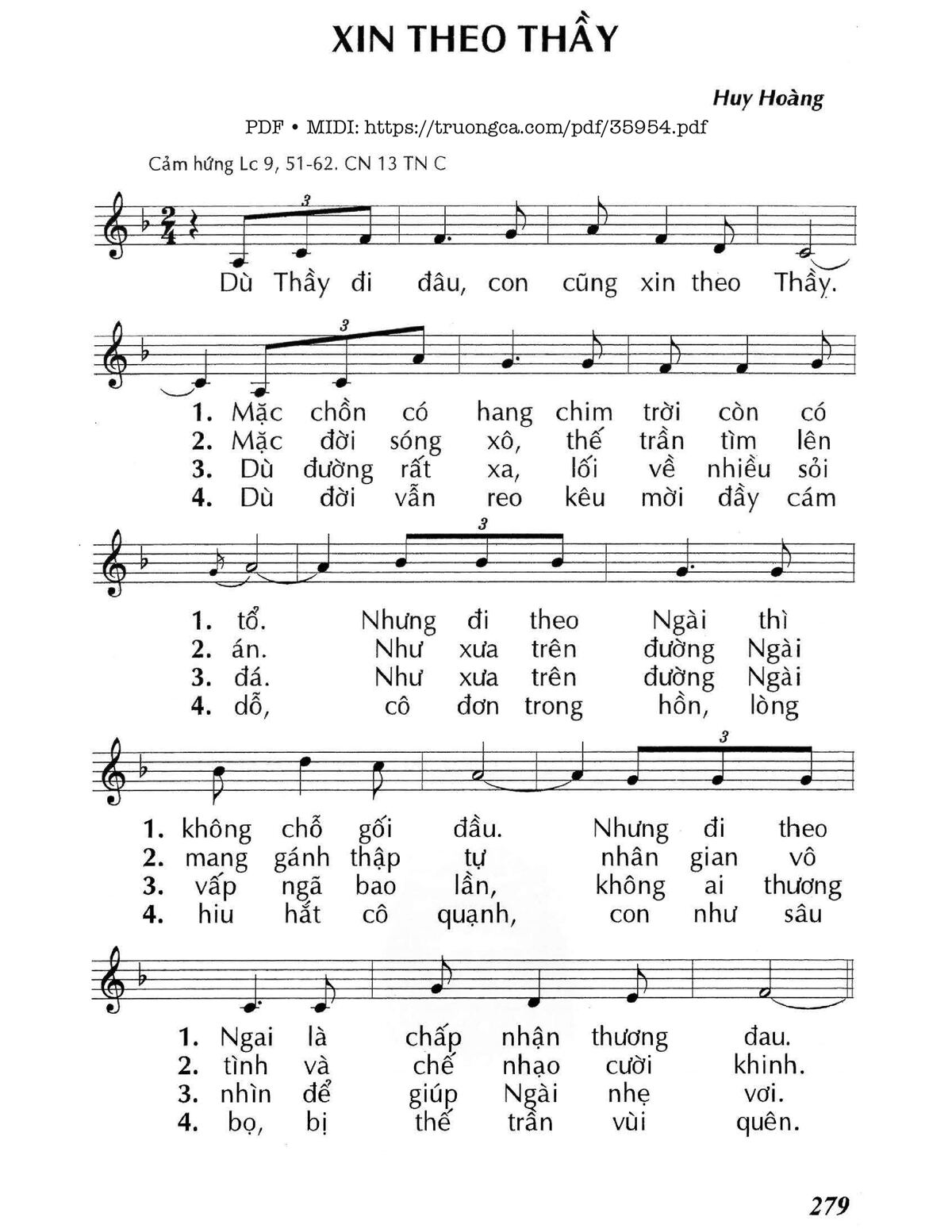 1. Dù Thầy đi đâu, con cũng xin theo Thầy. Mặc chồn có hang, chim trời còn có tổ. Nhưng đi theo Ngài thì không chỗ gối đầu. Nhưng đi theo Ngài là chấp nhận thương đau.