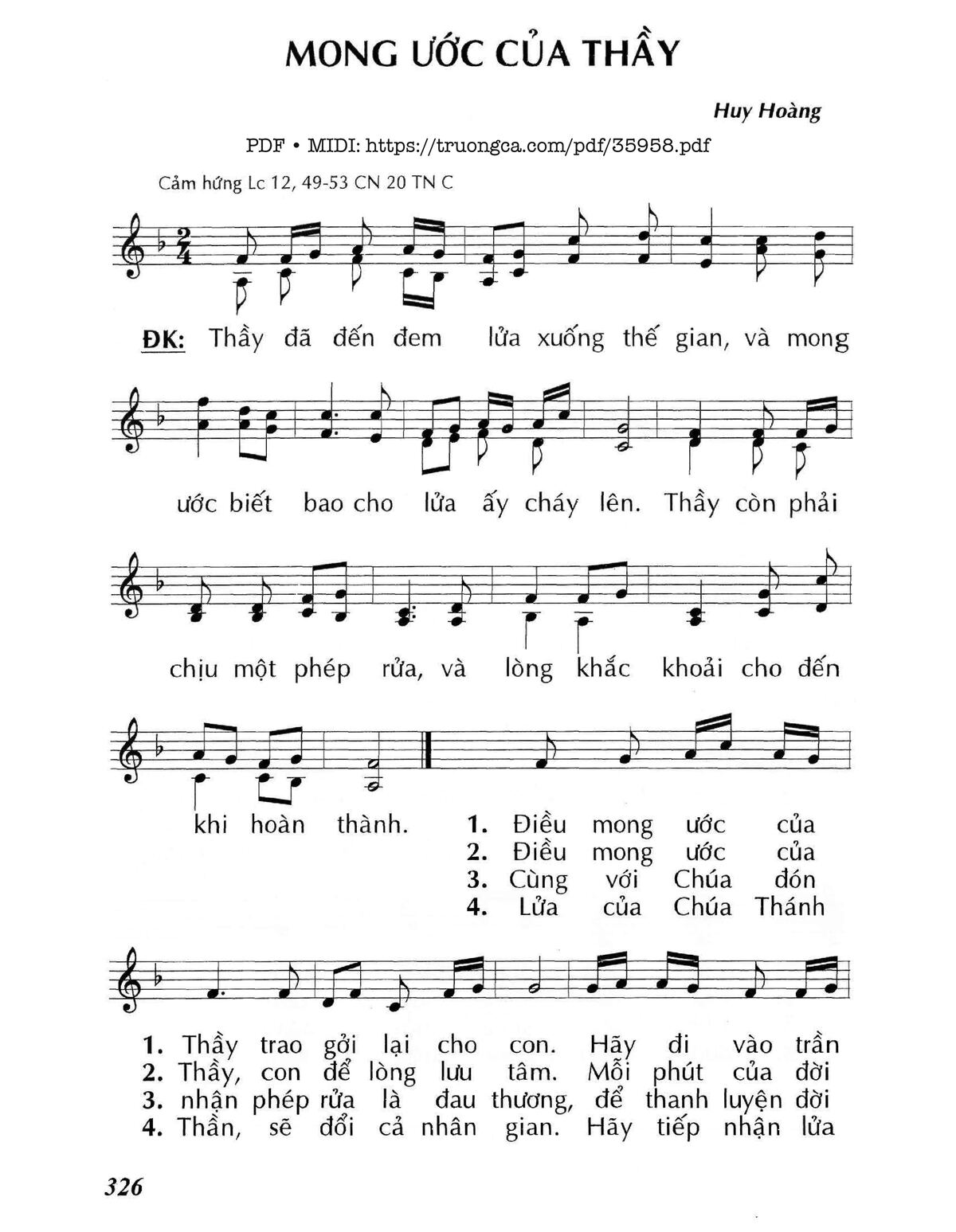 Điệp khúc: Thầy đã đến đem lửa xuống thế gian, và mong ước biết bao cho lửa ấy cháy lên. Thầy còn phải chịu một phép rử, và lòng khắc khoải cho đến khi hoàn thành.