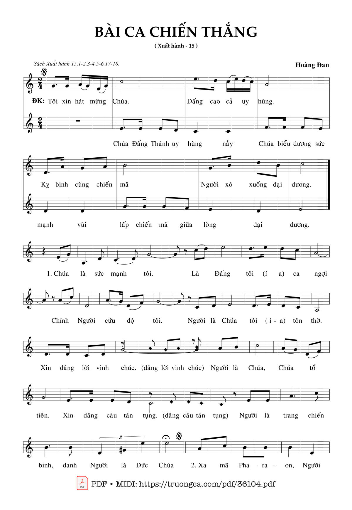 1. Chúa là sức mạnh tôi. Là Đấng tôi (í-a) ca ngợi. Chính Người cứu độ tôi. Người là Chúa tôi (í-a) tôn thờ. Xin dâng lời vinh chúc(dâng lời vinh chúc). Người là Chúa, Chúa tổ tiên. Xin dâng câu tán tụng (dâng câu tán tụng). Người là trang chiến binh, Danh Người là Đức Chúa.